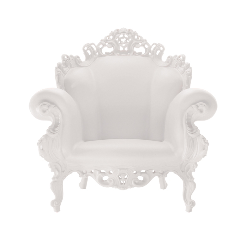 Une icône du design italien revisitée par Alessandro Mendini pour Magis. Réalisé en polyéthylène, le fauteuil, dessiné en 1978, est une véritable prouesse technique au regard de sa taille et de la complexité de ses ornements. Le designer avait déjà été remarqué pour son univers fantasque et son approche fantaisiste du design. D'inspiration Régence, Proust est un fauteuil à la personnalité forte et charismatique réinterprété ici dans un matériau très moderne pour accentuer l'univers extravagant de son designer. Tel un trône majestueux aux allures baroques, ses couleurs et sa taille s'invitent dans votre salon pour y apporter une touche humoristique mais aussi dans votre jardin grâce à son matériau résistant aux conditions atmosphériques. Proust est le symbole même du « Re-Design », concept cher à Mendini.