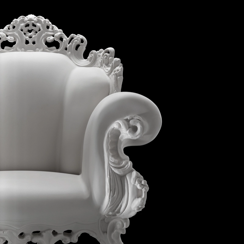Une icône du design italien revisitée par Alessandro Mendini pour Magis. Réalisé en polyéthylène, le fauteuil, dessiné en 1978, est une véritable prouesse technique au regard de sa taille et de la complexité de ses ornements. Le designer avait déjà été remarqué pour son univers fantasque et son approche fantaisiste du design. D'inspiration Régence, Proust est un fauteuil à la personnalité forte et charismatique réinterprété ici dans un matériau très moderne pour accentuer l'univers extravagant de son designer. Tel un trône majestueux aux allures baroques, ses couleurs et sa taille s'invitent dans votre salon pour y apporter une touche humoristique mais aussi dans votre jardin grâce à son matériau résistant aux conditions atmosphériques. Proust est le symbole même du « Re-Design », concept cher à Mendini.