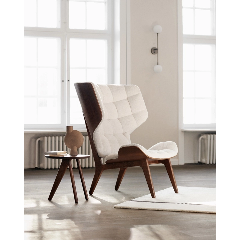 Mammoth de NORR11 est une bergère moderne et accueillante. Le dossier haut et enveloppant, ainsi que le rembourrage moelleux offrent un confort supérieur et un sentiment d'intimité. Le siège et le dossier sont formés à partir du même moule de compression, ce qui donne au fauteuil son look épuré et minimaliste. Le fauteuil Mammoth est disponible dans différentes combinaisons de bois et de tissus de grande qualité.