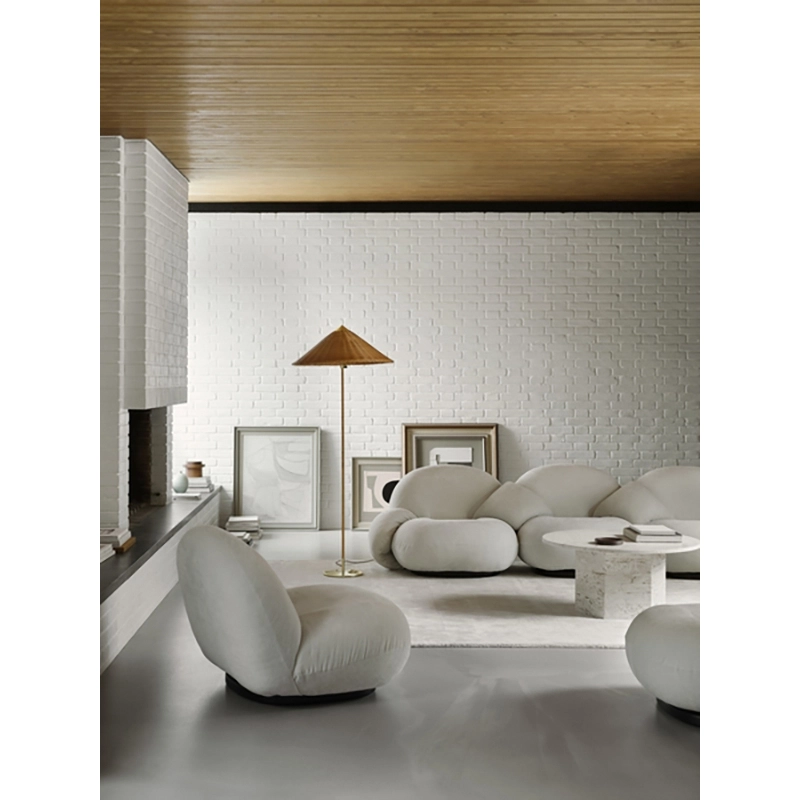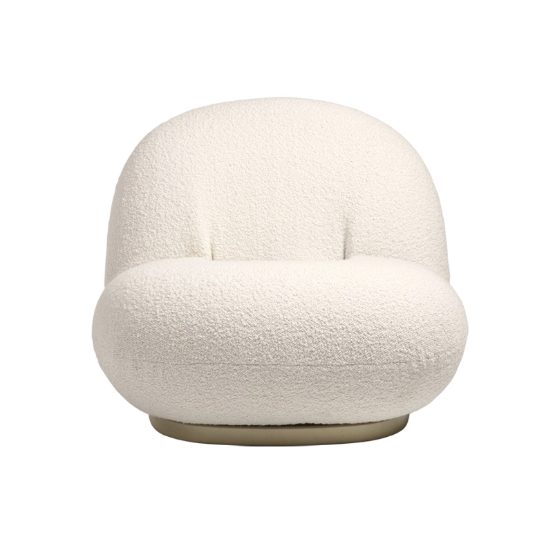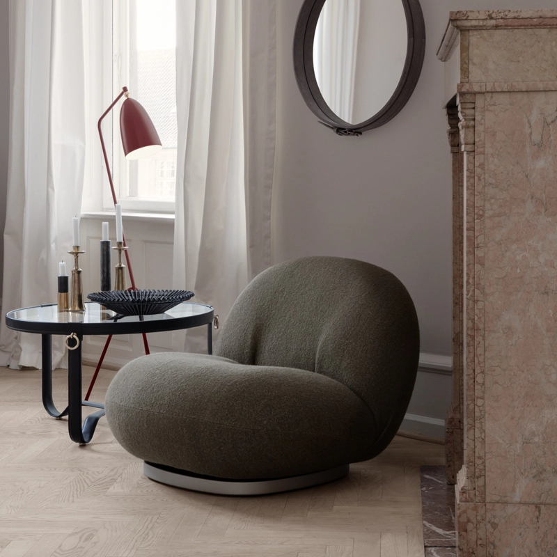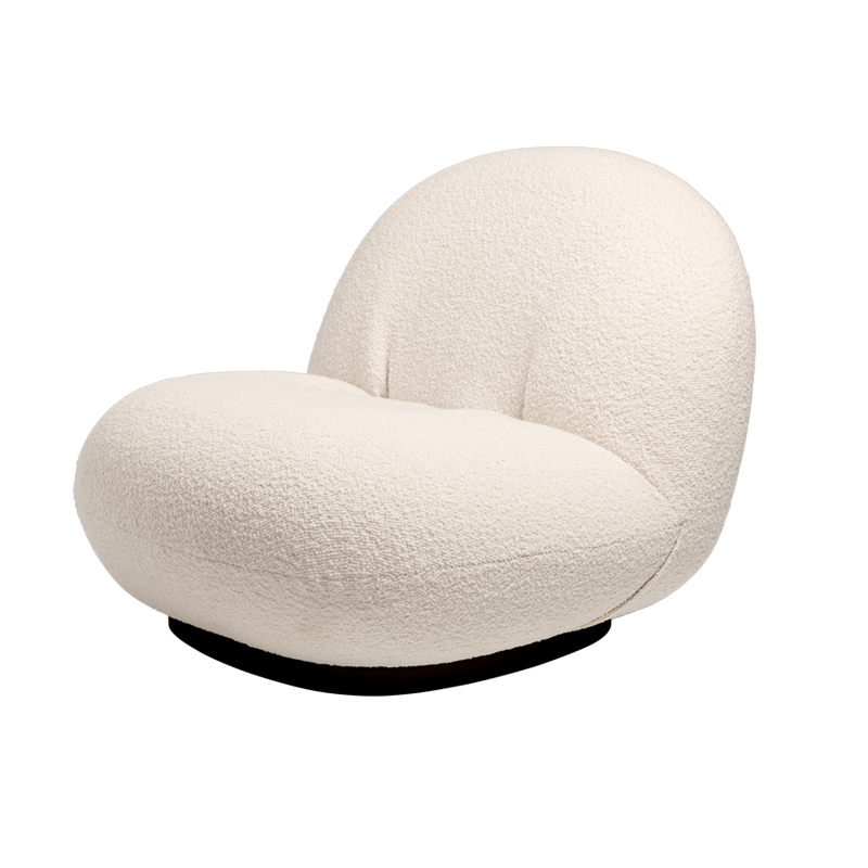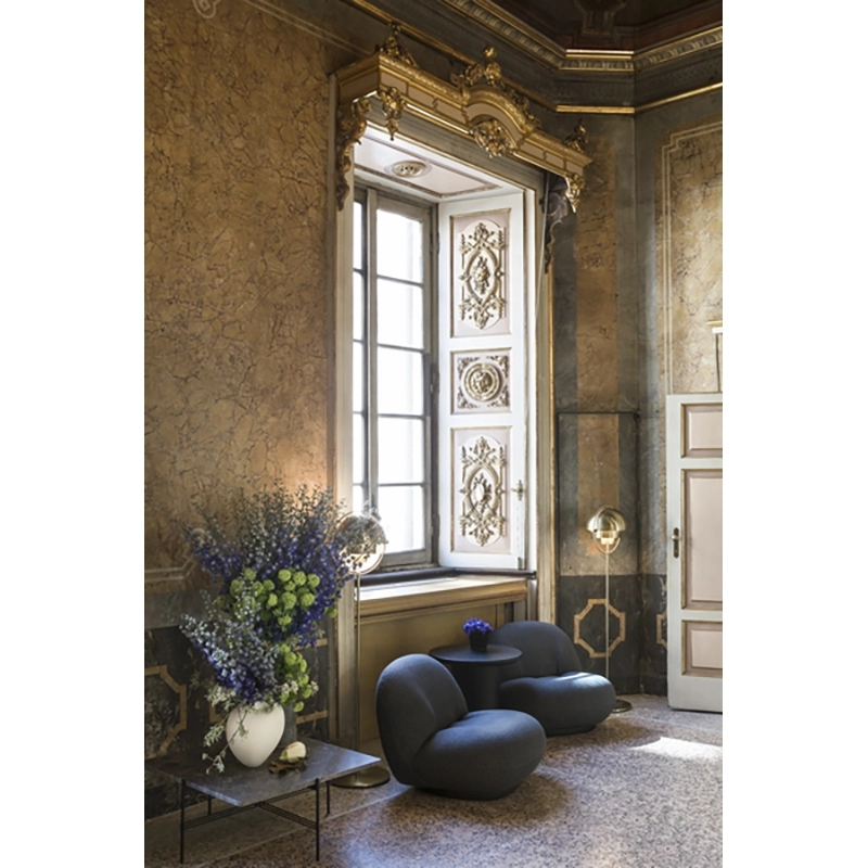 L'iconique fauteuil Pacha a été dessiné par Pierre Paulin en 1975 et est aujourd'hui réédité par la maison Gubi. Pierre Paulin est un des plus grands représentant du design français et a conçu quelques-uns des plus célèbres fauteuils du design contemporain, exposés dans les plus prestigieux musées. L'esthétique du fauteuil Pacha de Gubi est inspiré par la forme des nuages. Pierre Paulin a imaginé une nouvelle forme de design, remplaçant l’austérité d’après-guerre par une approche nouvelle beaucoup plus vigoureuse. Le fauteuil Pacha de Gubi illustre donc parfaitement la mutation du design des années 60, en allant vers une esthétique moins rigide, plus festive et décontractée. Pierre Paulin a réussi à donner une véritable élégance aux formes arrondies et fantaisistes du fauteuil Pacha de Gubi en trouvant les proportions parfaites. Les lignes de coutures du fauteuil participent à cette élégance. L’assise basse en mousse aux formes rebondies, est légèrement surélevée sur sa base où les coutures viennent souligner la silhouette. La base dépourvue des classiques quarre pieds donne à ce fauteuil Pacha une allure très contemporaine, qui apportera un souffle de modernité à un salon, une pièce çà vivre ou une chambre. Pierre Paulin été aussi l’un des premiers à se débarrasser des pieds des fauteuils et ainsi instaurer un nouveau mode de vie où l’on s’assoit plus proche du sol. Le résultat est un fauteuil moderne et durable qui offre confort et convivialité. Pierre Paulin a voulu pour le fauteuil Pacha, mettre une grande importance sur la notion de confort. En effet, le fauteuil Pacha de Gubi résulte d’une longue recherche sur la notion de confort moderne. Ce travail colle parfaitement à un souci de confort des corps des années 60. Son rembourrage entièrement coton rend le fauteuil Pacha très agréable au toucher grâce à sa douceur le rendant extrêmement confortable. Pacha est un modèle unique qui donne vie et caractère à tous les styles d’intérieurs. Gubi a élargi la collection en ajoutant le fauteuil Pacha avec accoudoirs, le canapé Pacha de deux à cinq places. Le fauteuil Pacha est recouvert d'un superbe tissu bouclé en laine et viscose, s'inspire des précieuses fourrures d'astrakan, au toucher de velours, confortable et épais. Pacha est également disponible dans une large gamme de tissus d’ameublement avec une base pivotante en or perlé original et en noir mat.