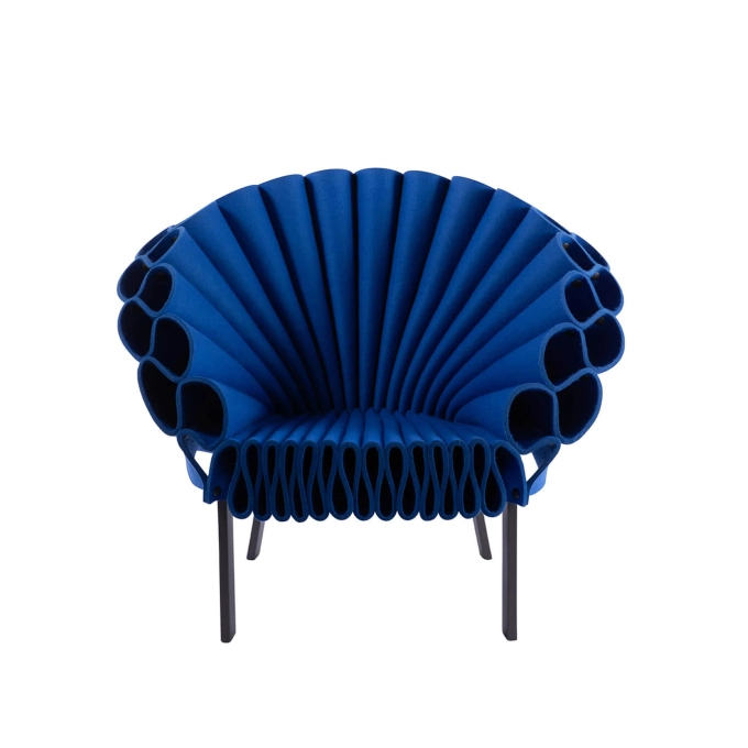 Le studio Dror collabore avec Cappellini pour créer un fauteuil original, imitant la roue du paon, d'où le nom « Peacock » en anglais. Le siège est entièrement réalisé à partir du pliage d'un panneau de feutre, fixé sur un piètement en métal verni à l'époxy marron foncé. Le feutre a ici une double fonction : il sert de revêtement et de rembourrage en même temps. Grâce au fronçage effectué, le textile devient également une structure en trois dimensions. Dans le salon, Peacock est aussi surprenant par son allure sculpturale, que par son grand confort.