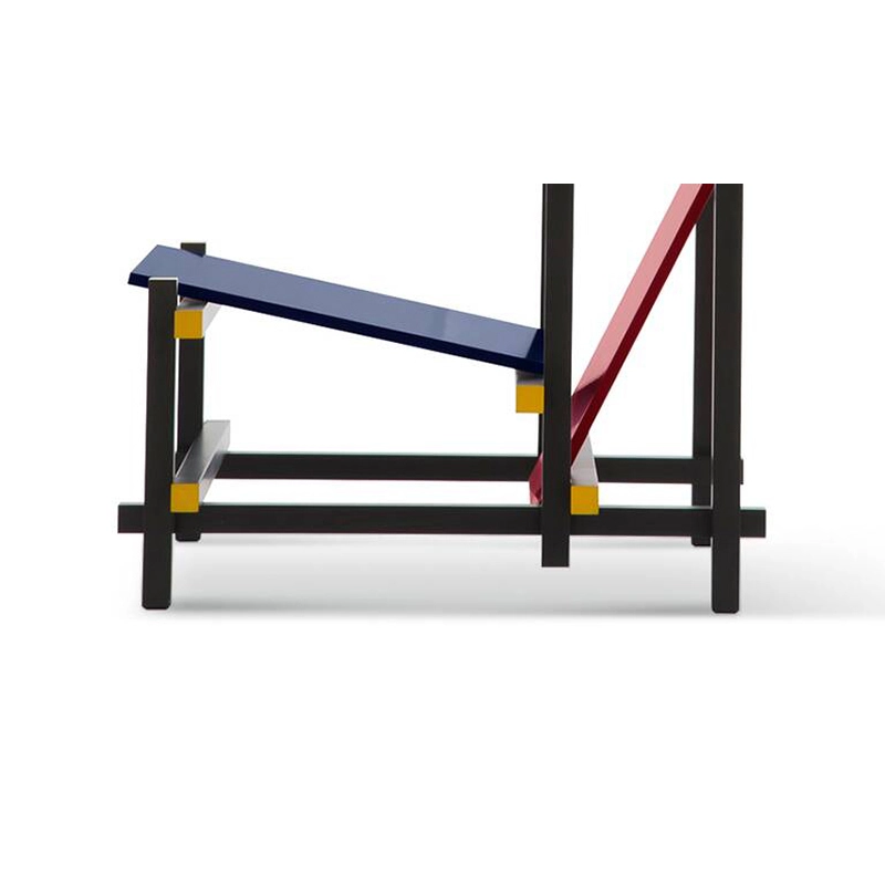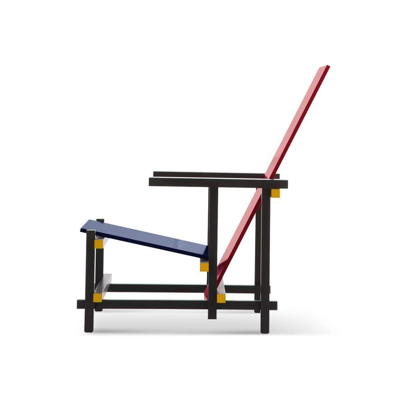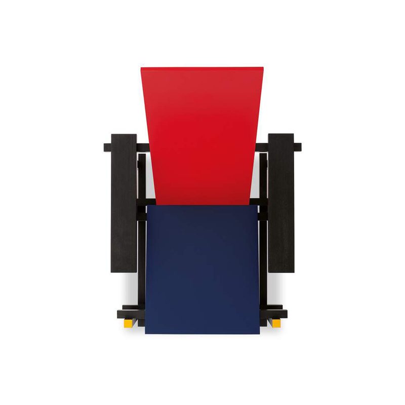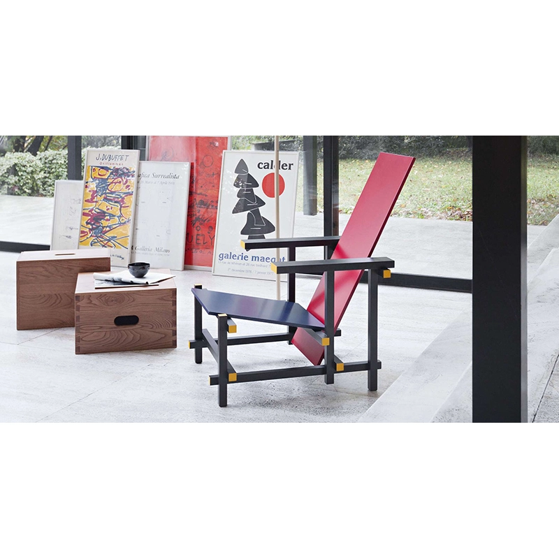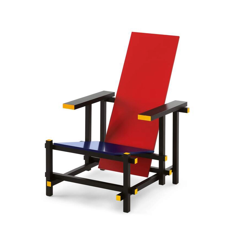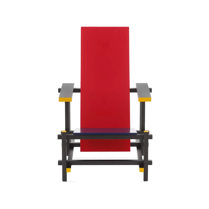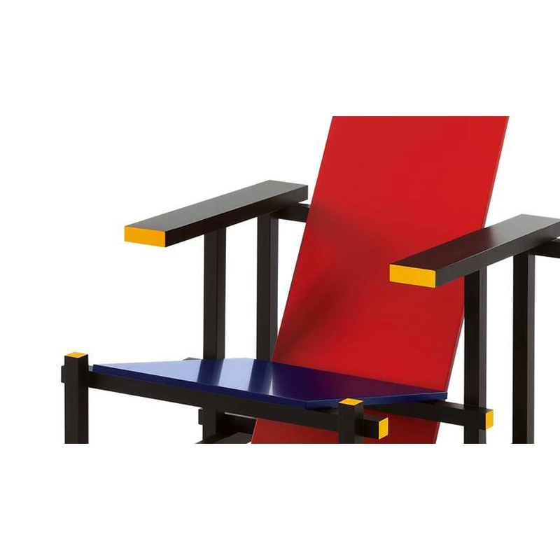 chaise Red and Blue incarne la pureté et la rationalité, reflétant les principes du néoplasticisme. Rietveld cherche à explorer l'essence des formes et l'harmonie des couleurs, privilégiant l'utilisation exclusive de l'angle droit. Les premiers prototypes, apparus en 1918, illustrent cette vision à travers une palette monochromatique. La différenciation chromatique, introduite plus tard, distingue les éléments selon leur fonction, créant un contraste entre la structure noire et les éléments d'appui colorés. Ce changement a entraîné le renommage de la