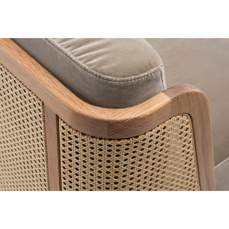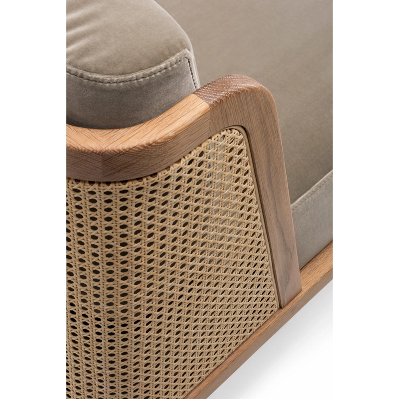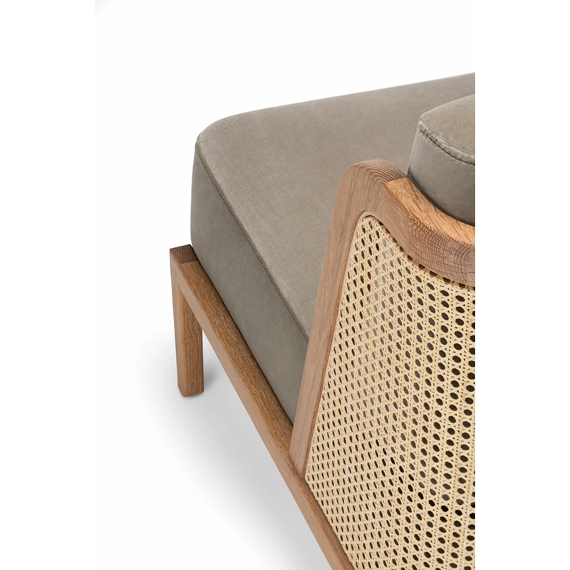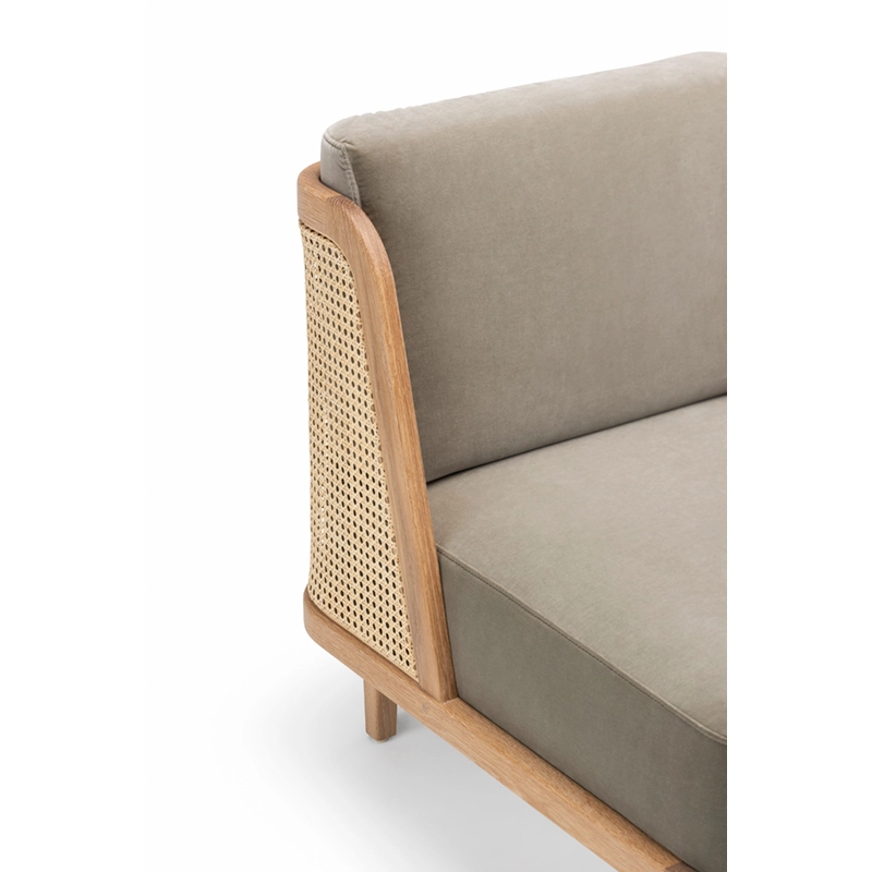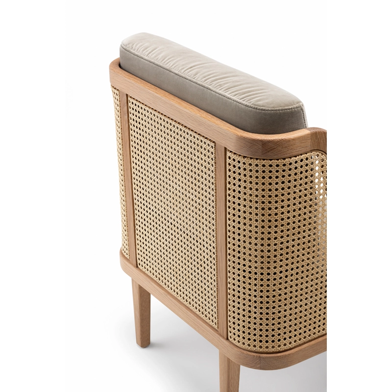noyer danois huilé, coussins assise et dossier tissu, dos cannage rotin