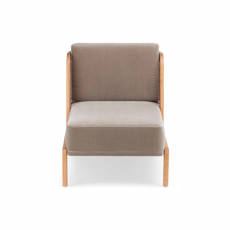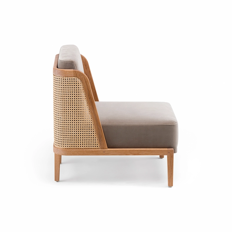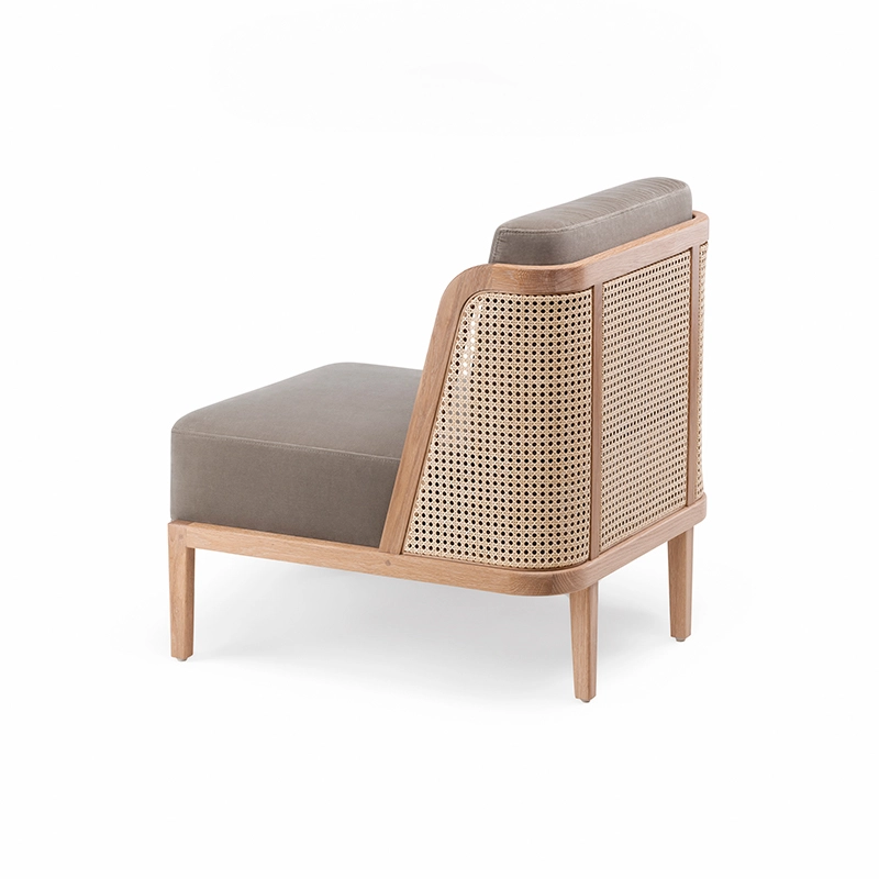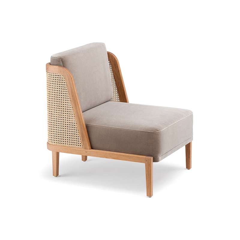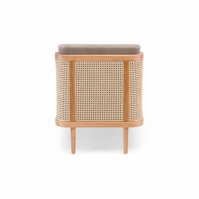 noyer danois huilé, coussins assise et dossier tissu, dos cannage rotin