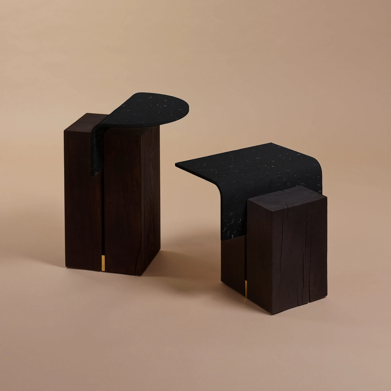 Chêne recyclé teinté au brou de noix, plastique recyclé, laiton