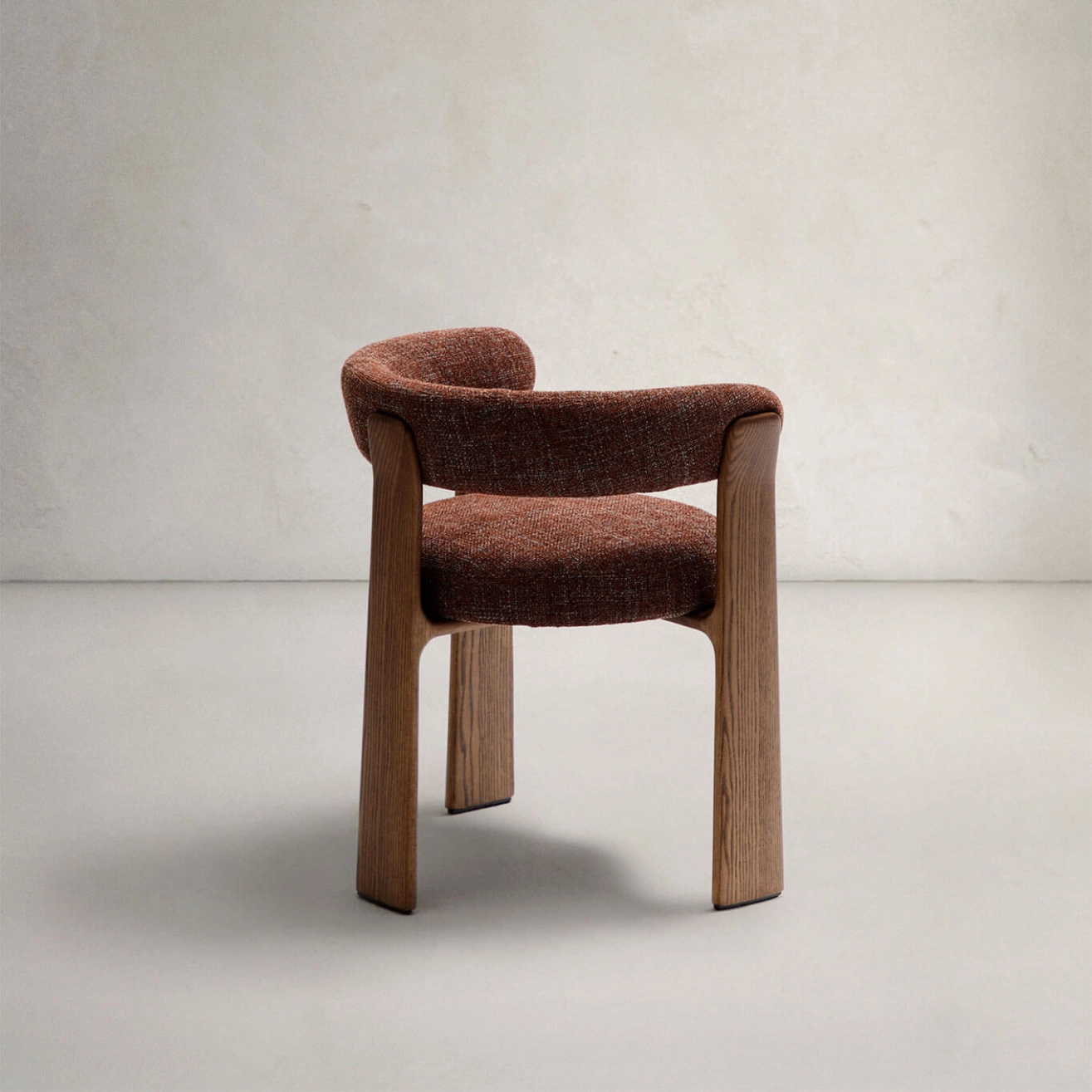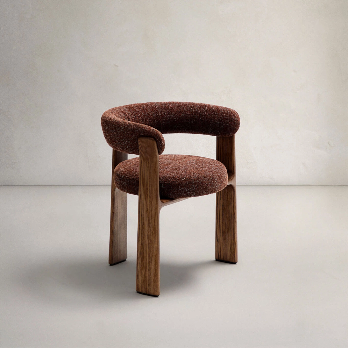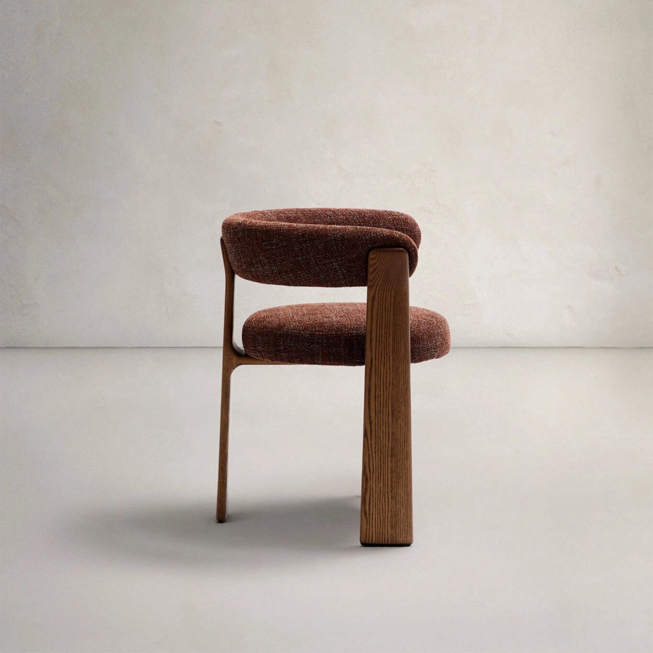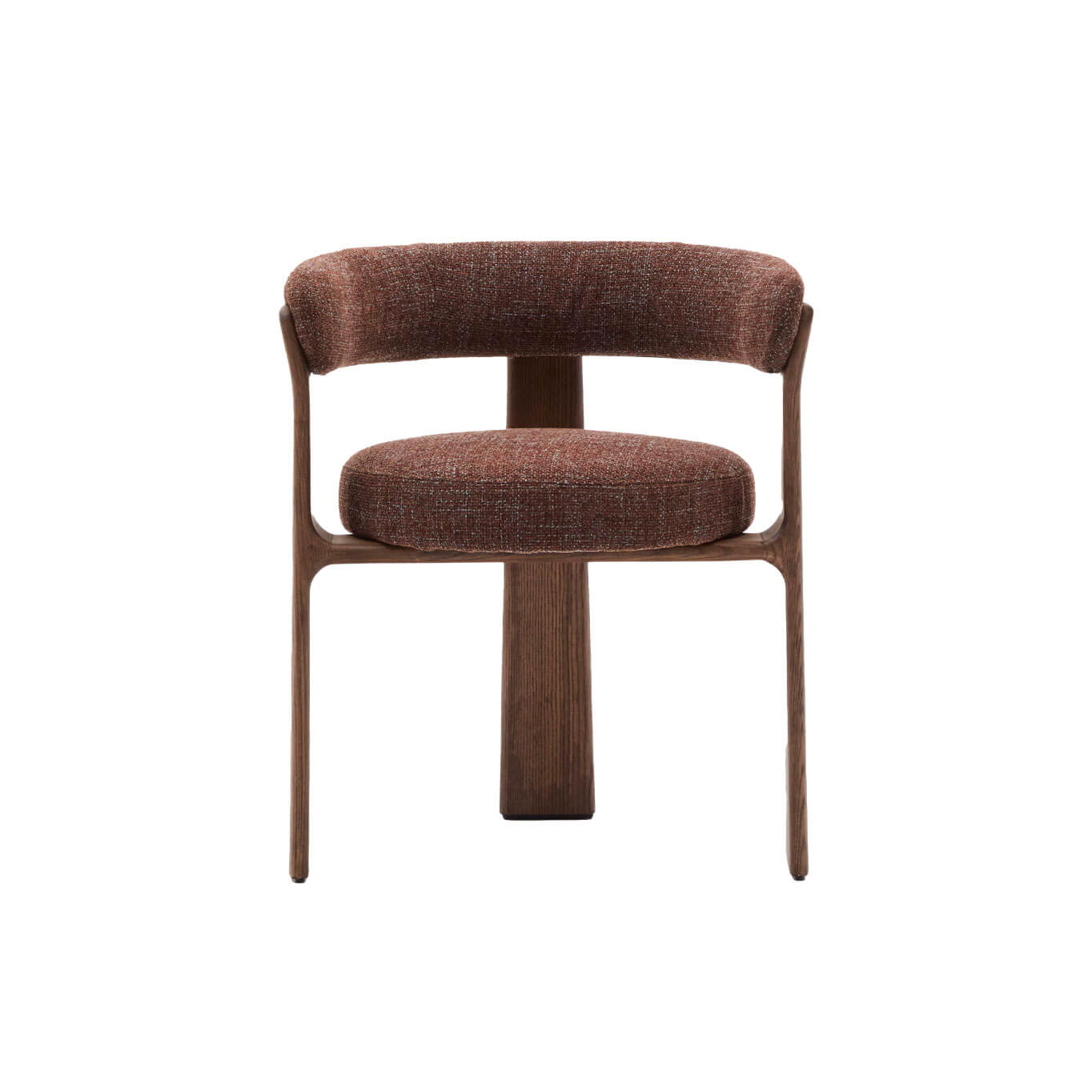 élégance intemporelle, inspirée du style scandinave des années 70, avec des formes généreuses, enveloppantes et résolument modernes. Son assise et son dossier sont habillés d’un tissu chenille épais, au toucher doux et chaleureux, dans une teinte marron bicolore subtilement nuancée. Ce tissu est composé de