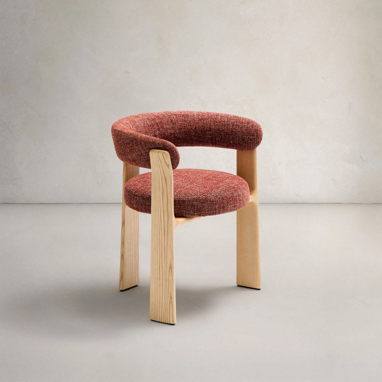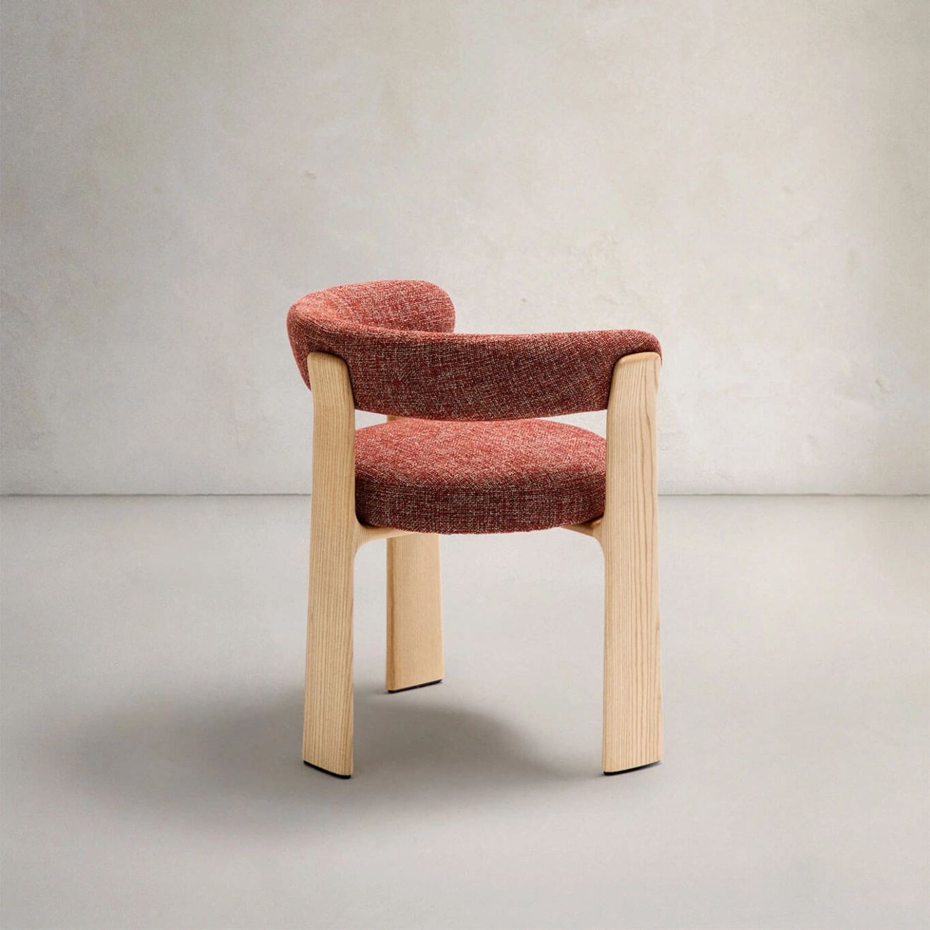 élégance intemporelle, inspirée du style scandinave des années 70, avec des formes généreuses, enveloppantes et résolument modernes. Son assise et son dossier sont habillés d’un tissu chenille épais, au toucher doux et chaleureux, dans une teinte terracotta bicolore subtilement nuancée. Ce tissu est composé de