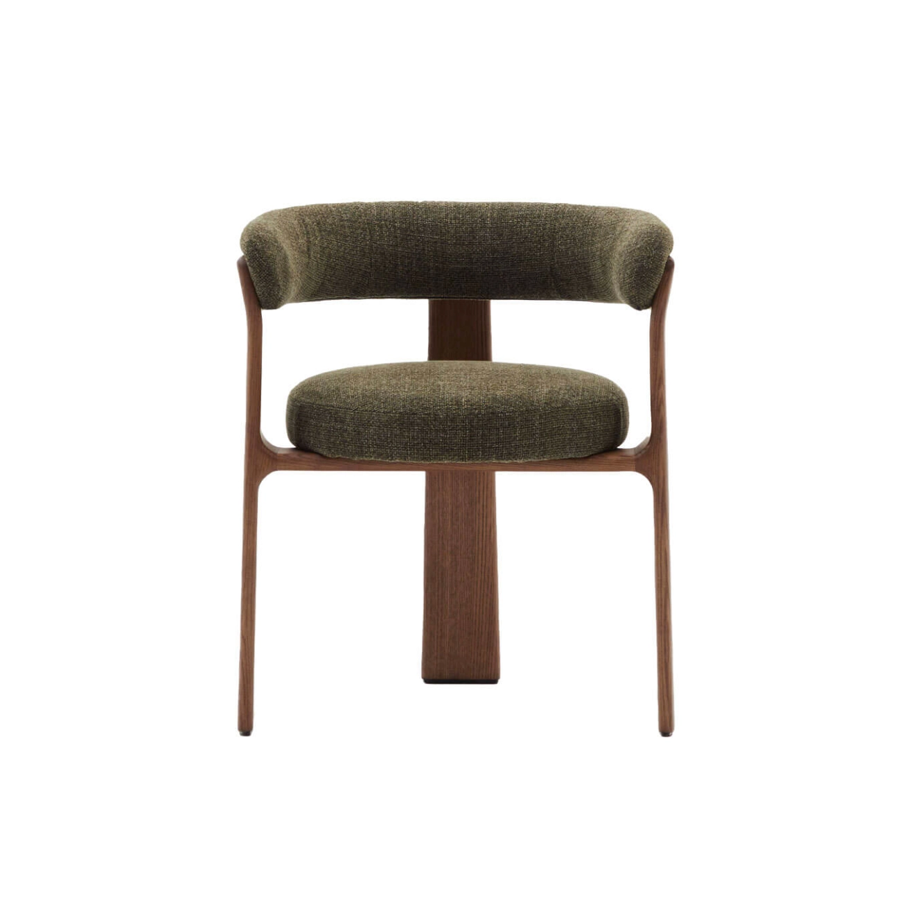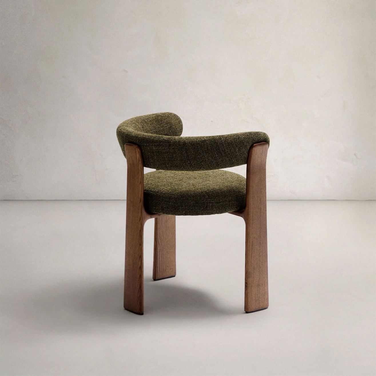 élégance intemporelle, inspirée du style scandinave des années 70, avec des formes généreuses, enveloppantes et résolument modernes. Son assise et son dossier sont habillés d’un tissu chenille épais, au toucher doux et chaleureux, dans une teinte vert bicolore subtilement nuancée. Ce tissu est composé de