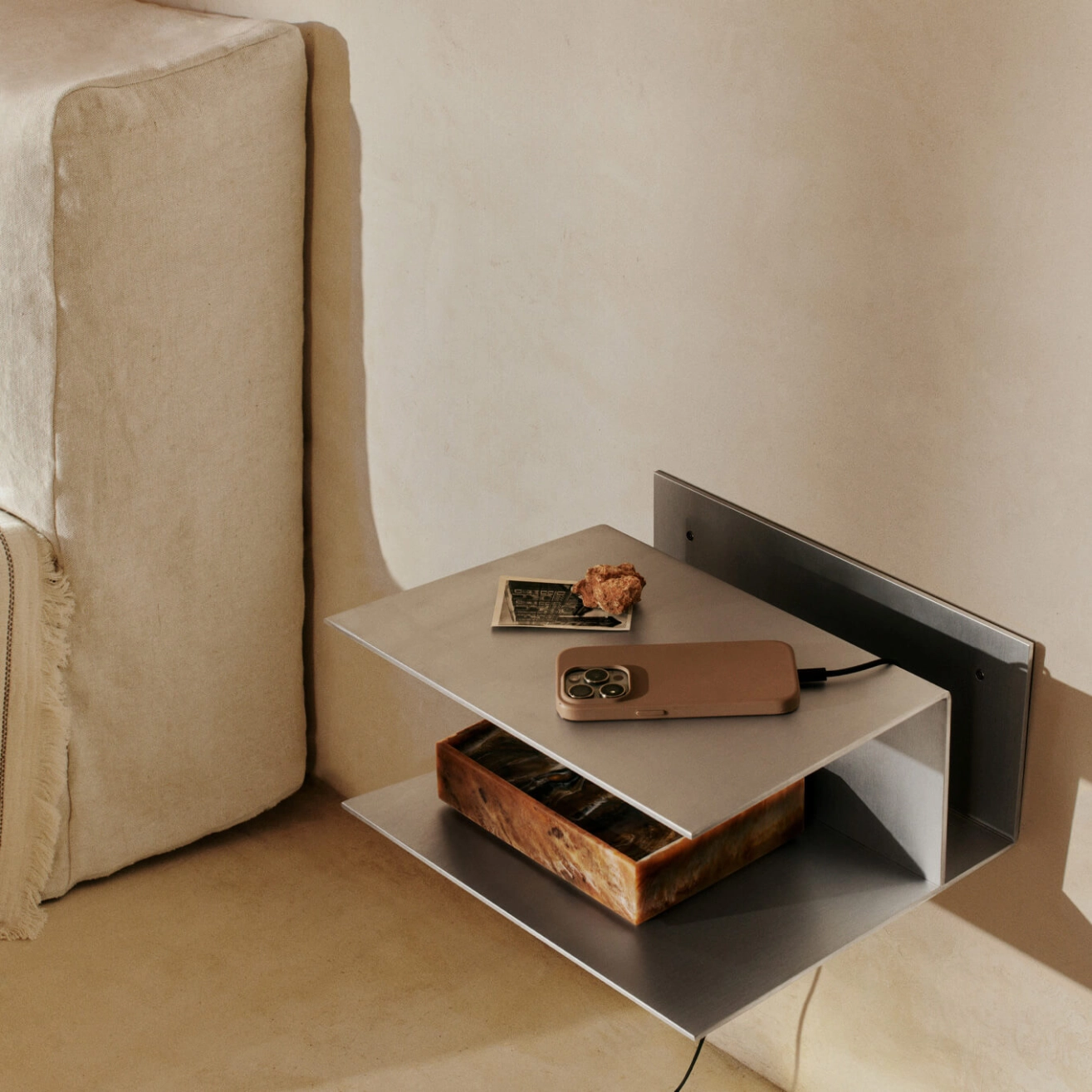La Table de chevet Lager, qui fait partie de la Famille Lager, tire son nom du mot danois signifiant « entrepôt » et s’inspire de l’esthétique industrielle du brutalisme. Fabriquée à partir de feuilles d'aluminium finement brossées, cette pièce élégante et fonctionnelle est conçue pour un montage mural sans faille. Dotée d’un système de gestion des câbles intégré, elle allie harmonieusement praticité et design raffiné, offrant un espace élégant et utile pour les objets essentiels tels que l’éclairage, les appareils électroniques, les livres et d’autres articles.