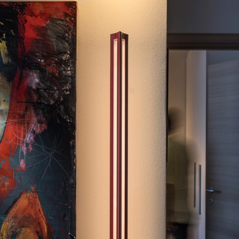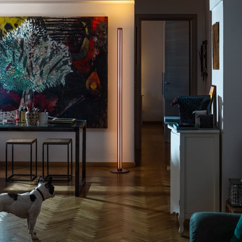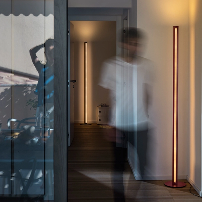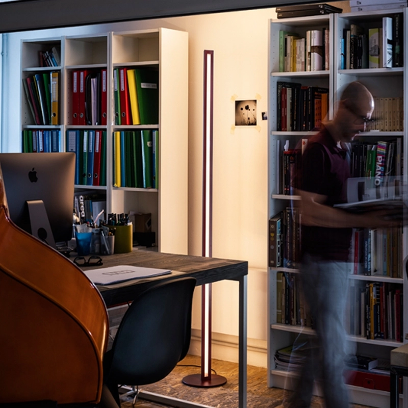 Avec son corps mince et léger et sa lumière chaude et accueillante, Chiaroscura est un lampadaire polyvalent. Simultanément discret et pourtant plein de caractère, le lampadaire Chiaroscura Foscarini diffuse à la fois une lumière indirecte puissante, provenant de la LED insérée au sommet, ainsi qu'une lumière vers le mur ou dirigée dans la pièce, selon le réglage de la lampe en fonction son orientation, grâce à la bande LED logée à l'intérieur. Edité par Foscarini, le lampadaire Chiaroscura est disponible en couleur rouge foncé ou titane, conférant au luminaire soit une personnalité plus audacieuse ou plus raffinée.