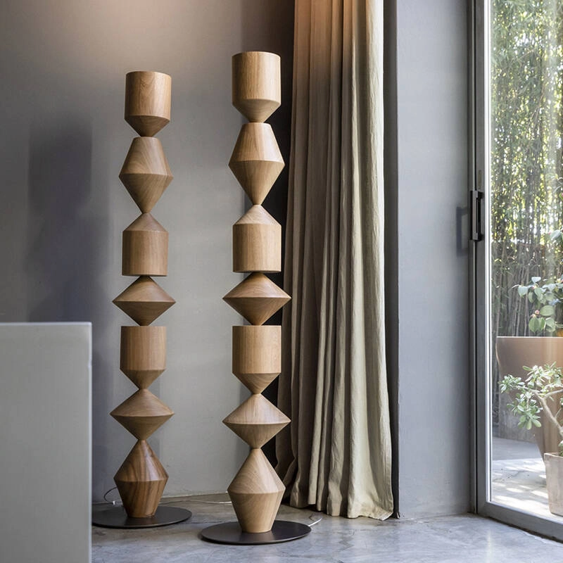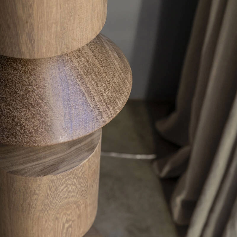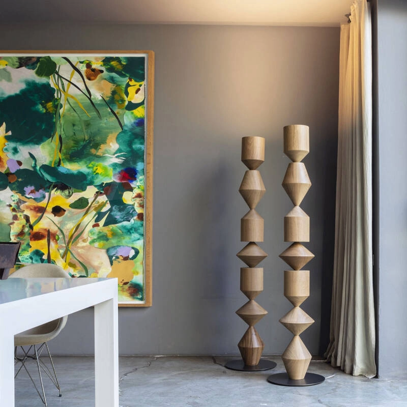 Costantina est un luminaire à éclairage indirect, donc l’épaisse structure géométrique se constitue de bois d’iroko massif, ou d’une enveloppe de polyuréthane rigide, ainsi qu’une base en métal bruni.