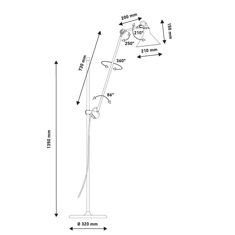 bras 73 cm, bielle 20 cm, barre 135 cm, abat-jour ø 21 cm