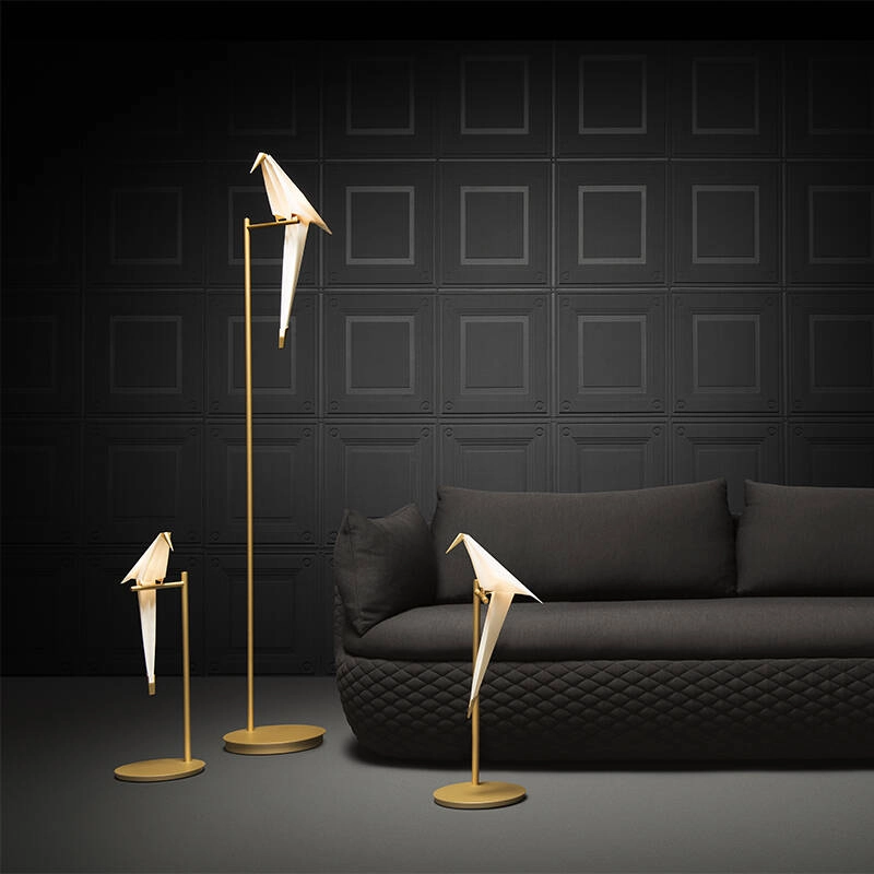 Toute la subtilité de Perch est comprise dans l’équilibre d’une fine structure en métal doré, qui relie la base ou la canopée de la lampe à son diffuseur, dissimulé dans la silhouette d'un oiseau.