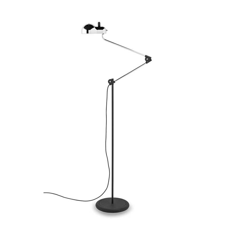 Edité par Stilnovo, le lampadaire Topo de Joe Colombo est un fascinant objet d'inspiration automobile : les fentes sur la calotte métallique rappellent les prises d'air des voitures de sport des années 1960, tandis que la forme de l'abat-jour correspond à l'enveloppe de l'ampoule classique E27 logée à l'intérieur, comme un corps sur le moteur sous-jacent. Les bras articulés en métal du lampadaire Topo permettent d'orienter simplement la lumière.