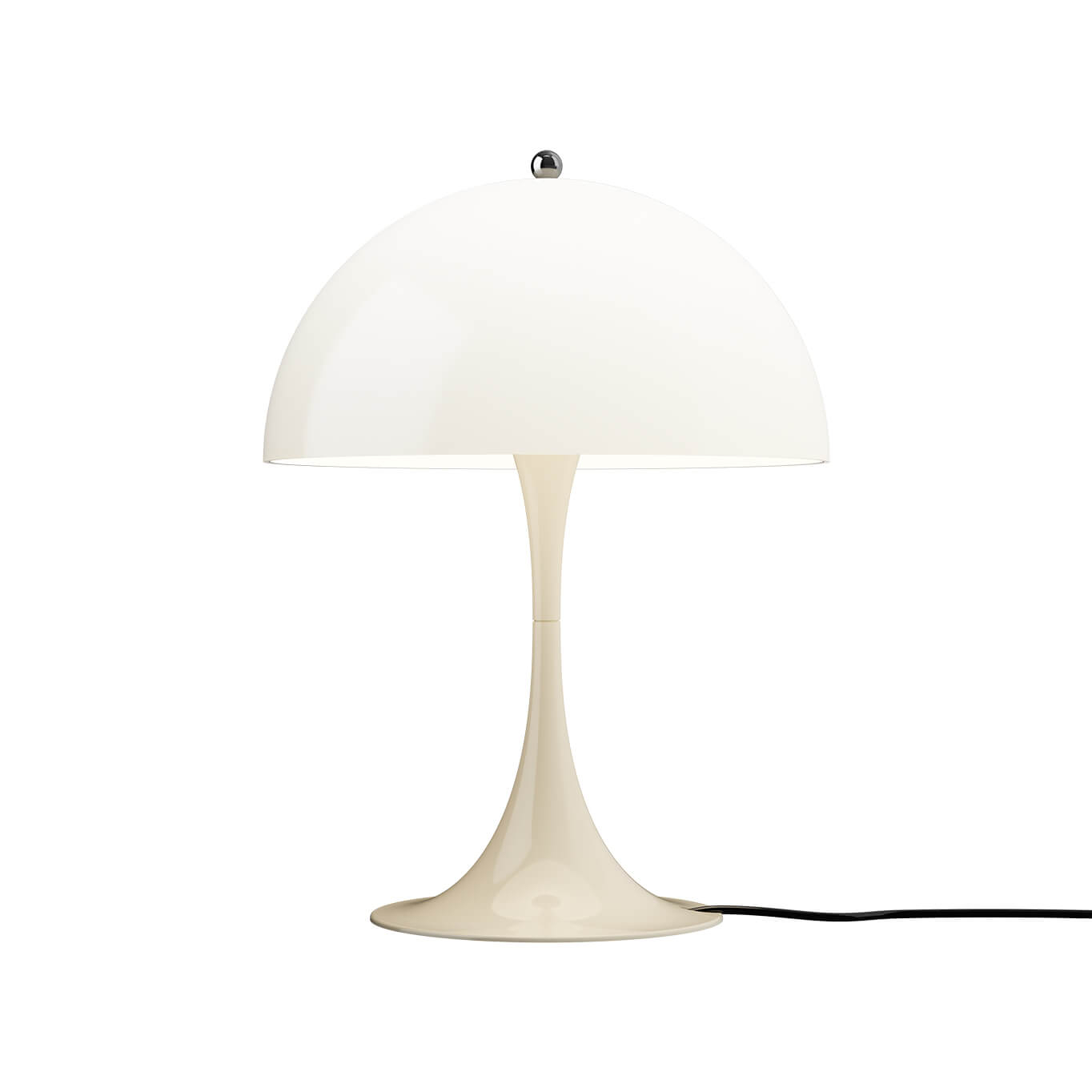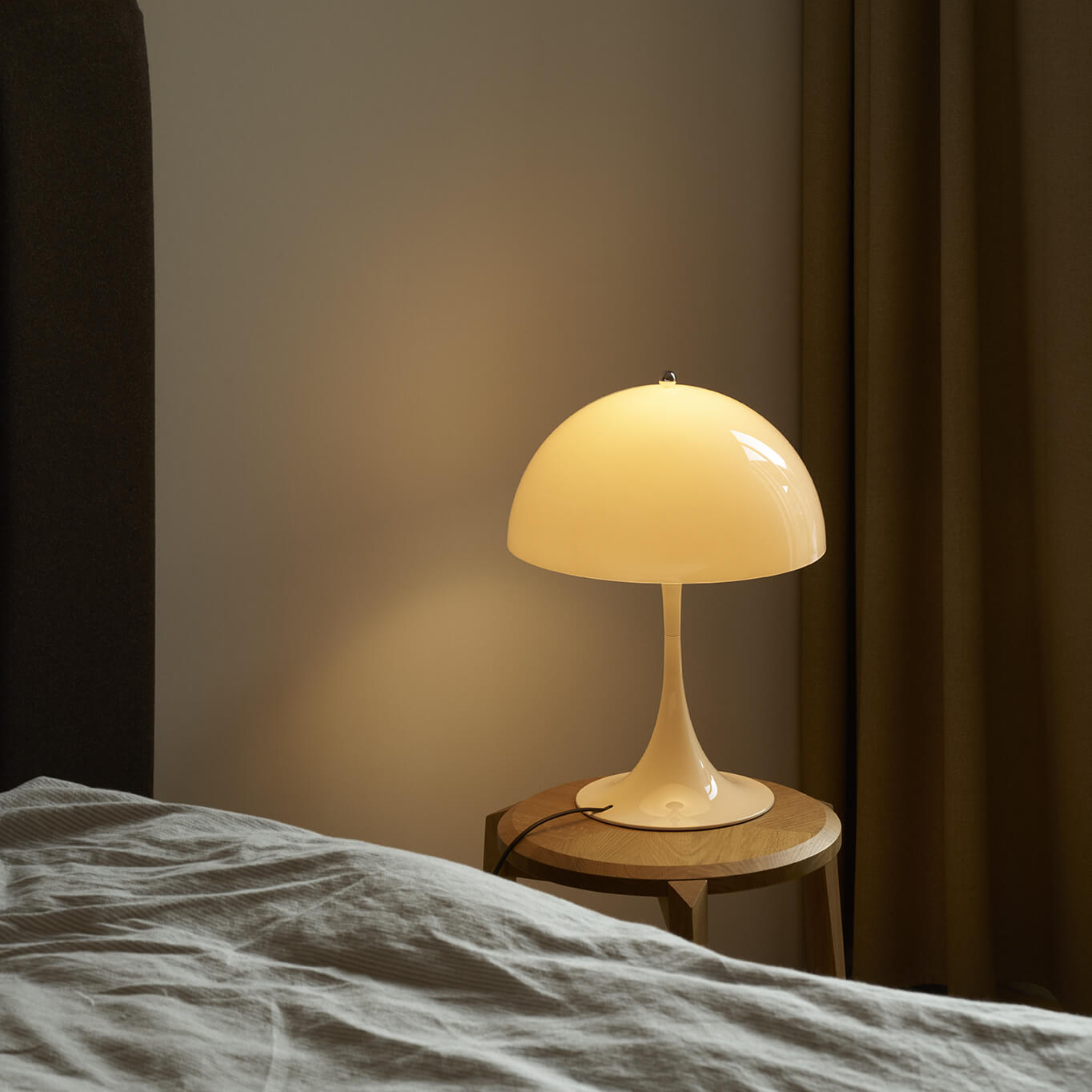 lampe de table Panthella génère une atmosphère lumineuse diffuse et confortable grâce à sa transparence, à la réflexion vers le bas créée par l’abat-jour intérieur, et à la réflexion créée par le pied en forme de trompette.