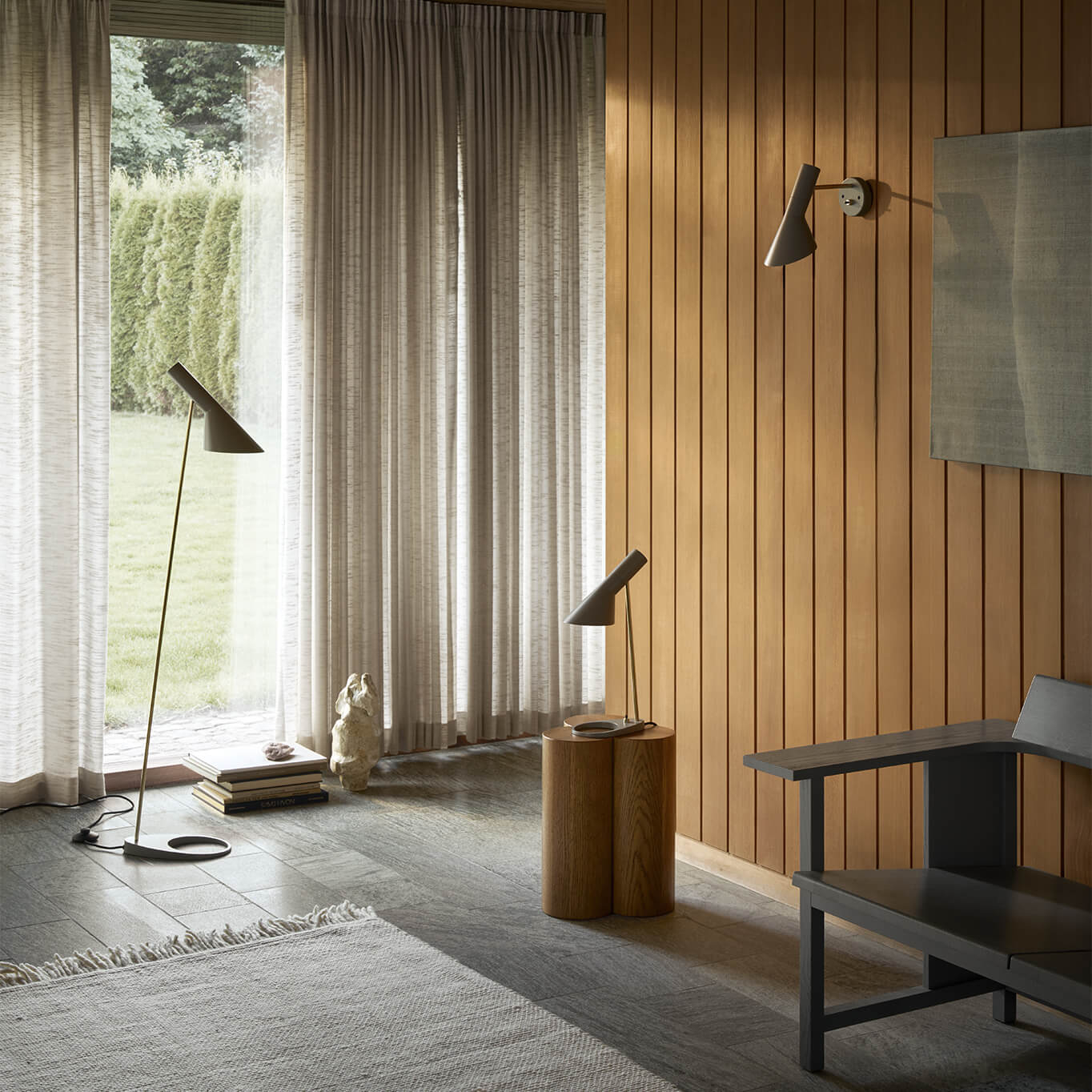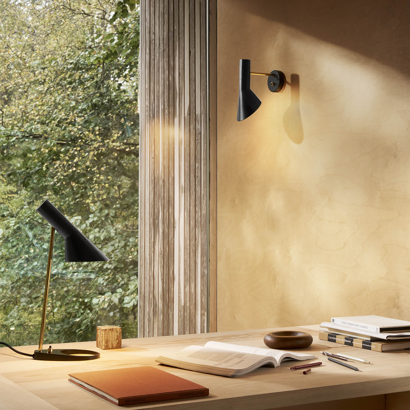 Dessinés par Arne Jacobsen en 1957 pour le SAS Royal Hôtel à Copenhague (Radisson Blu), les luminaires AJ faisaient partie, à l’origine, du concept de design complet créé pour l'Hôtel. Editée par Louis Poulsen, la lampe de table AJ Mini possède une expression graphique iconique, qui s’aligne merveilleusement avec le style de design de Jacobsen et tout en offrant un contraste avec la courbure de certains meubles du SAS Royal Hotel. Le design intemporel de la lampe permet une adaptation à tous les intérieurs et, au fil des ans, les palettes de couleurs ont été adaptées aux tendances des intérieurs modernes. L’angle de l’abat-jour de la lampe AJ Mini peut être réglé pour optimiser la distribution de la lumière. L’abat-jour est peint en blanc à l’intérieur pour diffuser une lumière douce et confortable.