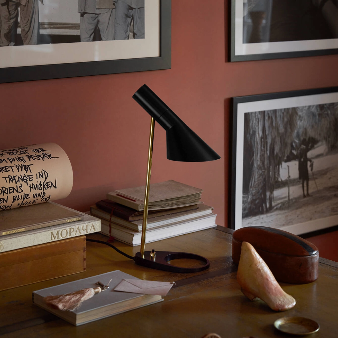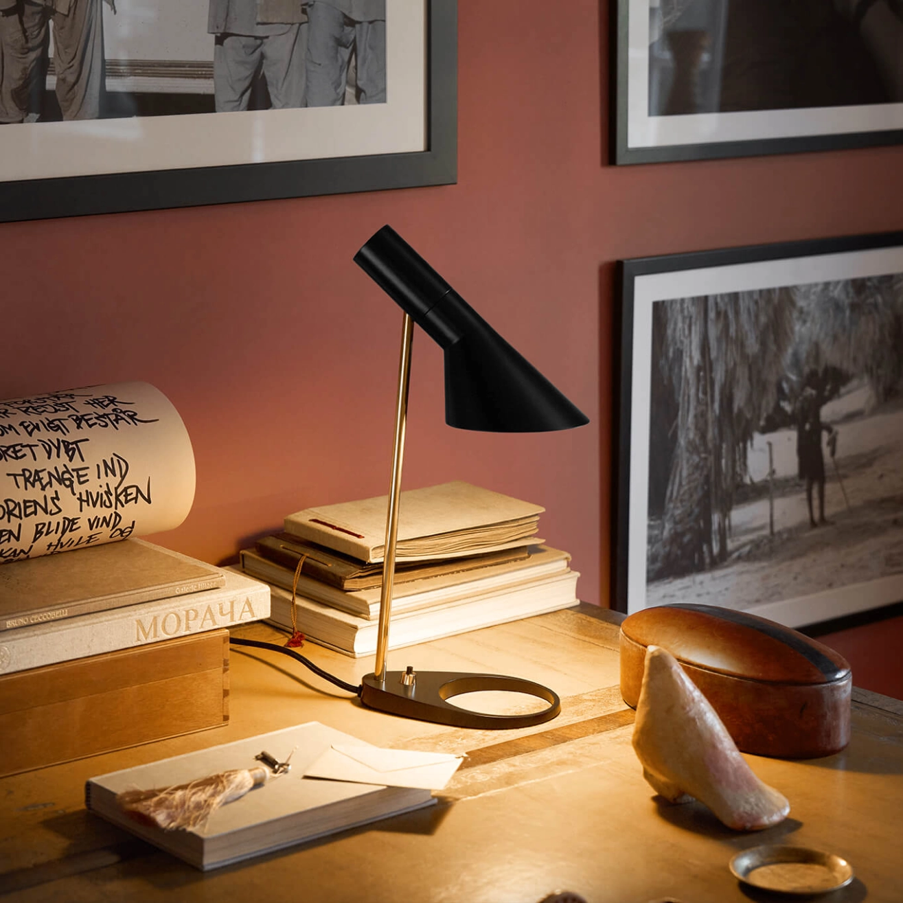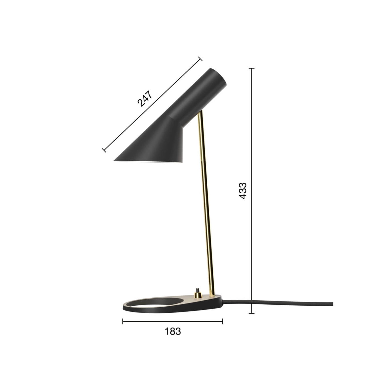 Dessinés par Arne Jacobsen en 1957 pour le SAS Royal Hôtel à Copenhague (Radisson Blu), les luminaires AJ faisaient partie, à l’origine, du concept de design complet créé pour l'Hôtel. Editée par Louis Poulsen, la lampe de table AJ Mini possède une expression graphique iconique, qui s’aligne merveilleusement avec le style de design de Jacobsen et tout en offrant un contraste avec la courbure de certains meubles du SAS Royal Hotel. Le design intemporel de la lampe permet une adaptation à tous les intérieurs et, au fil des ans, les palettes de couleurs ont été adaptées aux tendances des intérieurs modernes. L’angle de l’abat-jour de la lampe AJ Mini peut être réglé pour optimiser la distribution de la lumière. L’abat-jour est peint en blanc à l’intérieur pour diffuser une lumière douce et confortable.