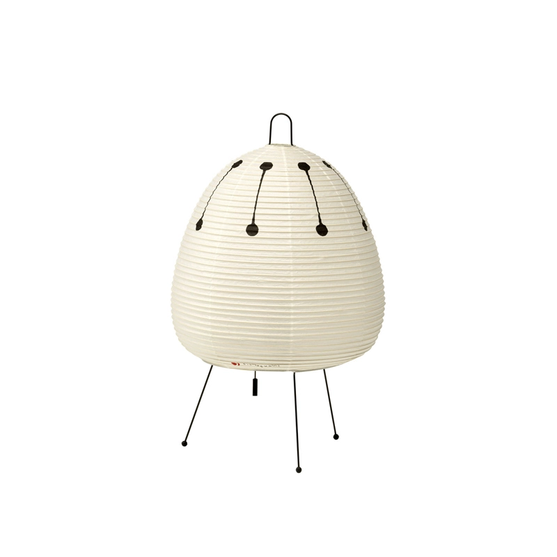 Chacun des luminaires dont Akari 1AD est fabriqué à la main : l’ossature de la lampe est obtenue par des tiges de bambou tendues, enveloppées de fines bandelettes de papier washi collées à la structure. Le corps des lampadaires et lampes à poser repose sur un élégant piètement en acier peint.