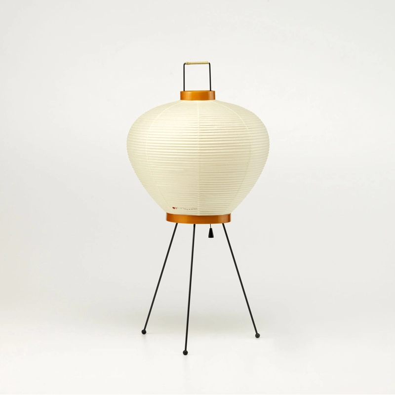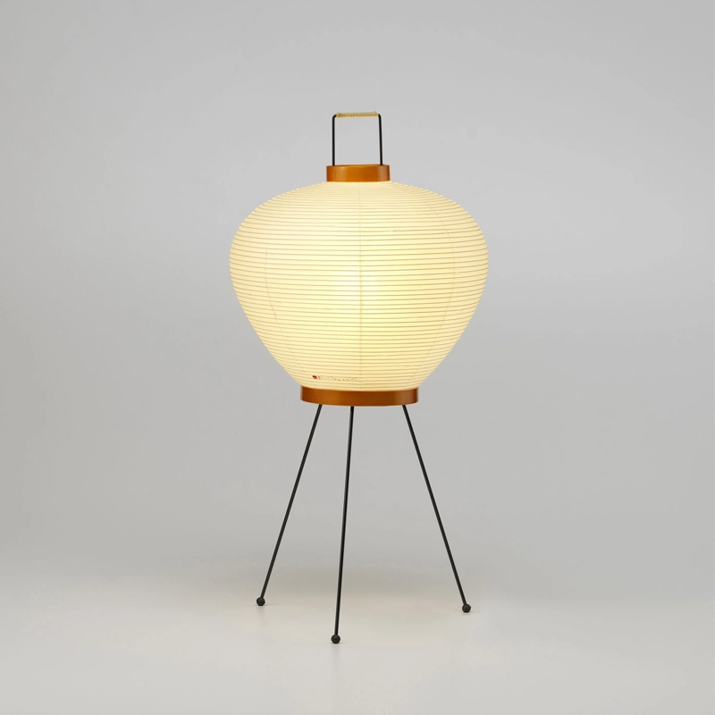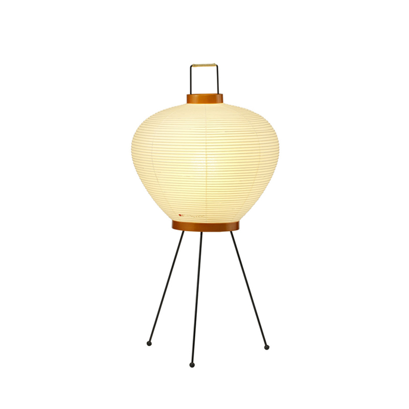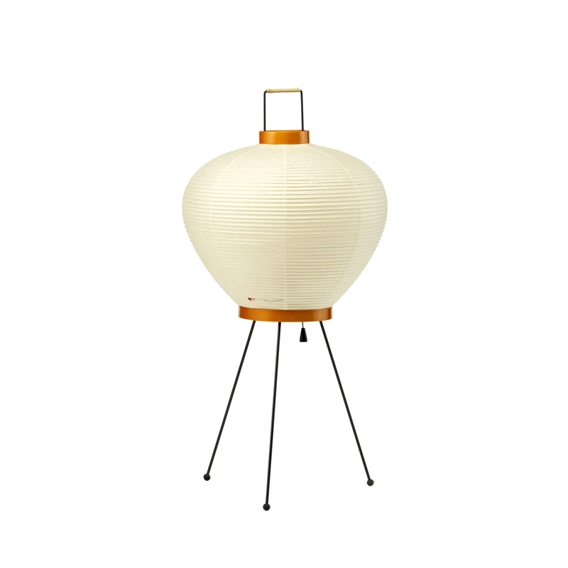 Chacun des luminaires dont Akari 3A est fabriqué à la main : l’ossature de la lampe est obtenue par des tiges de bambou tendues, enveloppées de fines bandelettes de papier washi collées à la structure. Le corps des lampadaires et lampes à poser repose sur un élégant piètement en acier peint.