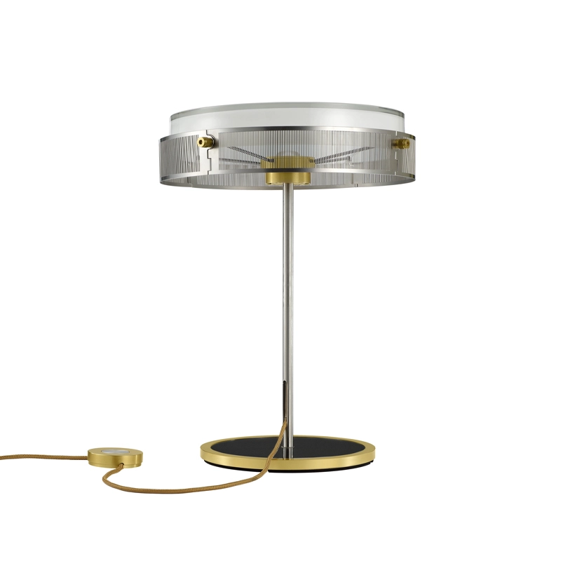 La lampe Anima repose sur une base en verre transparent délimitée par un anneau anodisé, et équipée d’un variateur d’intensité.