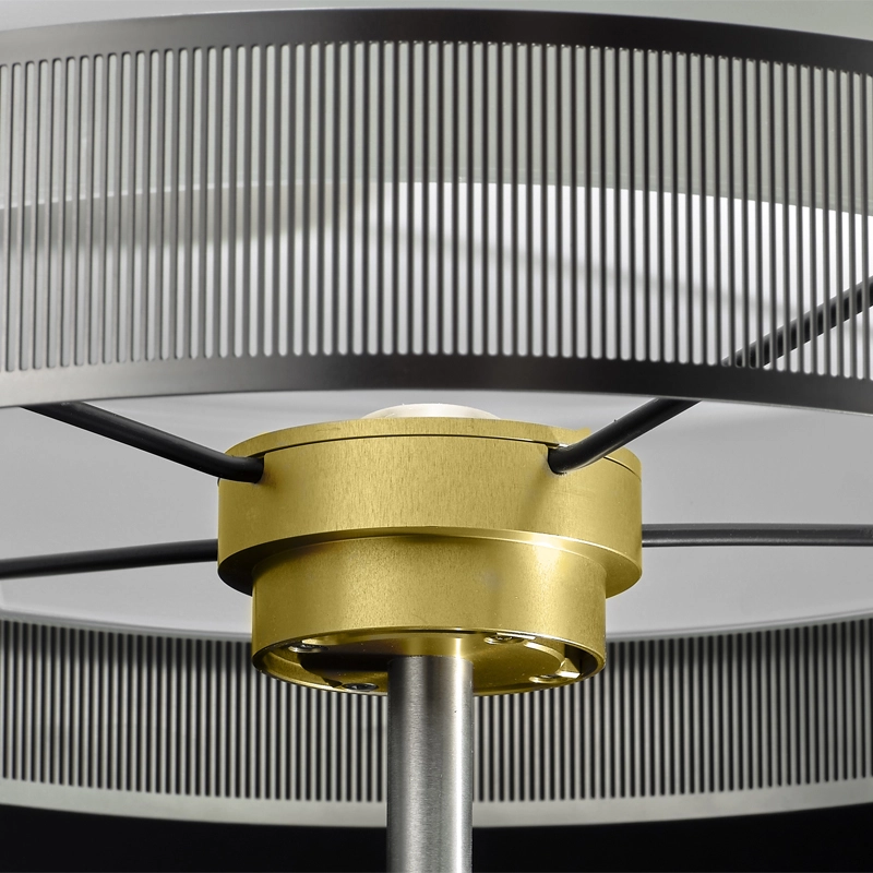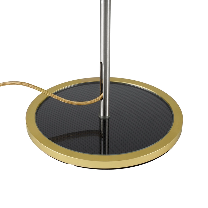 Cet ensemble est maintenu par une tige en acier inoxydable brossé qui abrite et laisse apparaître le câble d’alimentation en tissu, dont le coloris s’accorde à la finition métallique de la lampe.