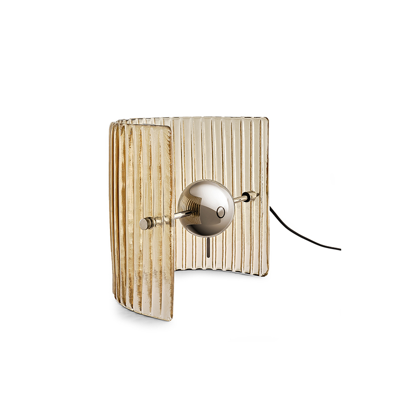 La lampe de table Bonfire Stripes de Studiopepe pour Gallotti&Radice diffuse sa lumière à travers un magnifique verre fuselé cannelé et courbé. Elégante et sculpturale, Bonfire trouve sa place partout dans la maison.