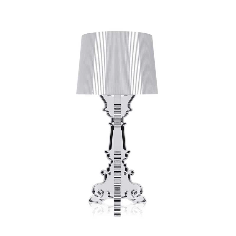 Bourgie, créée par Ferruccio Laviani pour Kartell, est une lampe de table mélangeant tradition et modernité. Sa base, de style baroque, est constituée de trois niveaux décorés qui s'entrecroisent et son ample abat-jour est réalisé avec un effet plissé de manière à créer, lorsque la lampe est allumée, un jeu de mille reflets. Grâce à un système d'accrochage particulier de l'abat-jour, il est possible d'obtenir trois hauteurs différentes (68, 73 et 78 cm). Chacun peut choisir de monter la lampe Bourgie à la hauteur qu'il préfère puis la modifier à sa guise selon l'utilisation qu'il veut en faire. Bourgie est une icône design de la collection de luminaires Kartell et est disponible en finition argent, cristal ou noir.