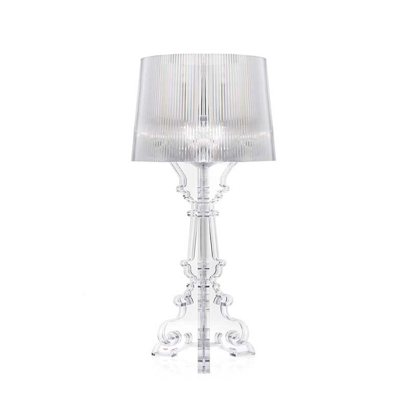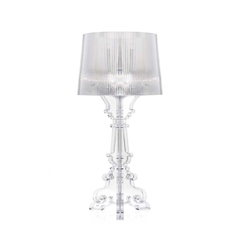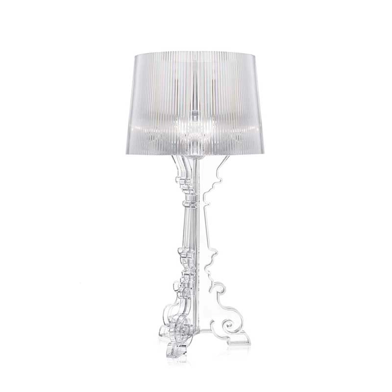 Bourgie, créée par Ferruccio Laviani pour Kartell, est une lampe de table mélangeant tradition et modernité. Sa base, de style baroque, est constituée de trois niveaux décorés qui s'entrecroisent et son ample abat-jour est réalisé avec un effet plissé de manière à créer, lorsque la lampe est allumée, un jeu de mille reflets. Grâce à un système d'accrochage particulier de l'abat-jour, il est possible d'obtenir trois hauteurs différentes (68, 73 et 78 cm). Chacun peut choisir de monter la lampe Bourgie à la hauteur qu'il préfère puis la modifier à sa guise selon l'utilisation qu'il veut en faire. Bourgie est une icône design de la collection de luminaires Kartell et est disponible en finition argent, cristal ou noir.