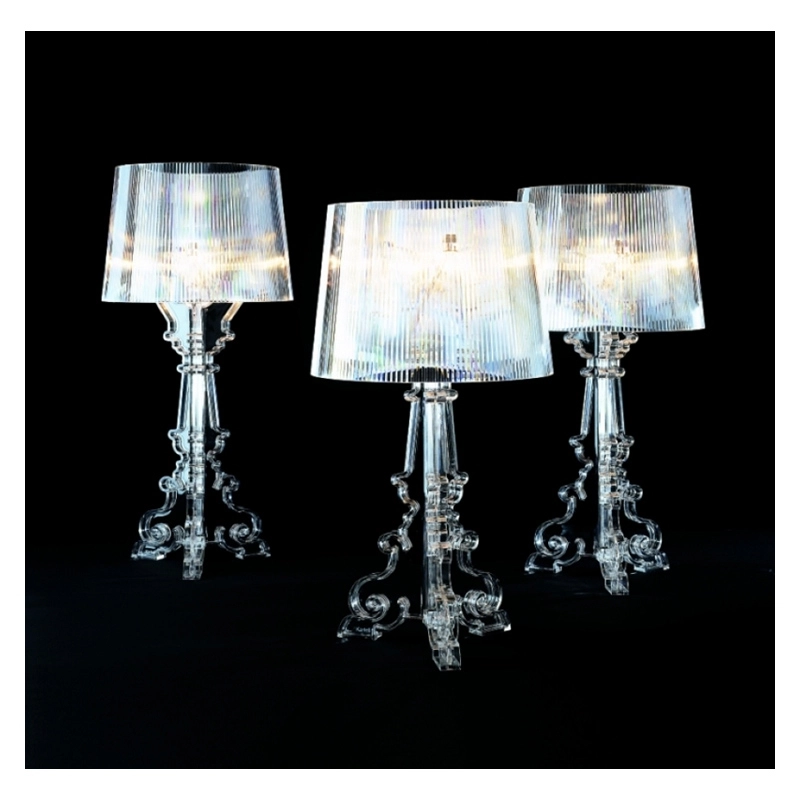 Bourgie, créée par Ferruccio Laviani pour Kartell, est une lampe de table mélangeant tradition et modernité. Sa base, de style baroque, est constituée de trois niveaux décorés qui s'entrecroisent et son ample abat-jour est réalisé avec un effet plissé de manière à créer, lorsque la lampe est allumée, un jeu de mille reflets. Grâce à un système d'accrochage particulier de l'abat-jour, il est possible d'obtenir trois hauteurs différentes (68, 73 et 78 cm). Chacun peut choisir de monter la lampe Bourgie à la hauteur qu'il préfère puis la modifier à sa guise selon l'utilisation qu'il veut en faire. Bourgie est une icône design de la collection de luminaires Kartell et est disponible en finition argent, cristal ou noir.