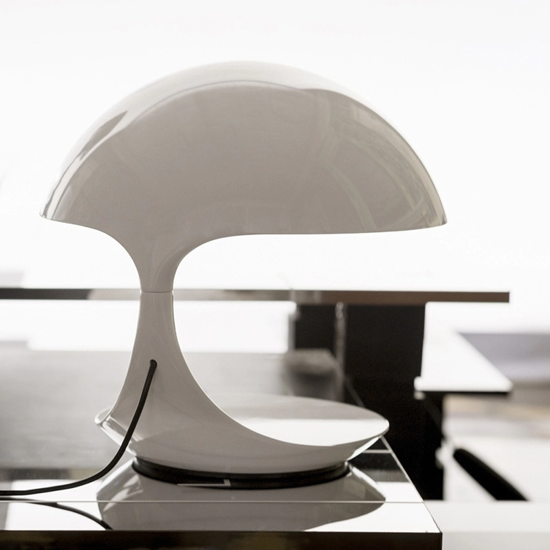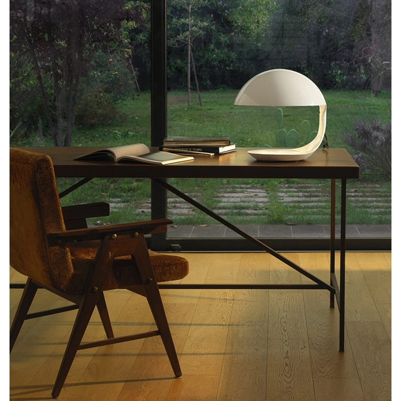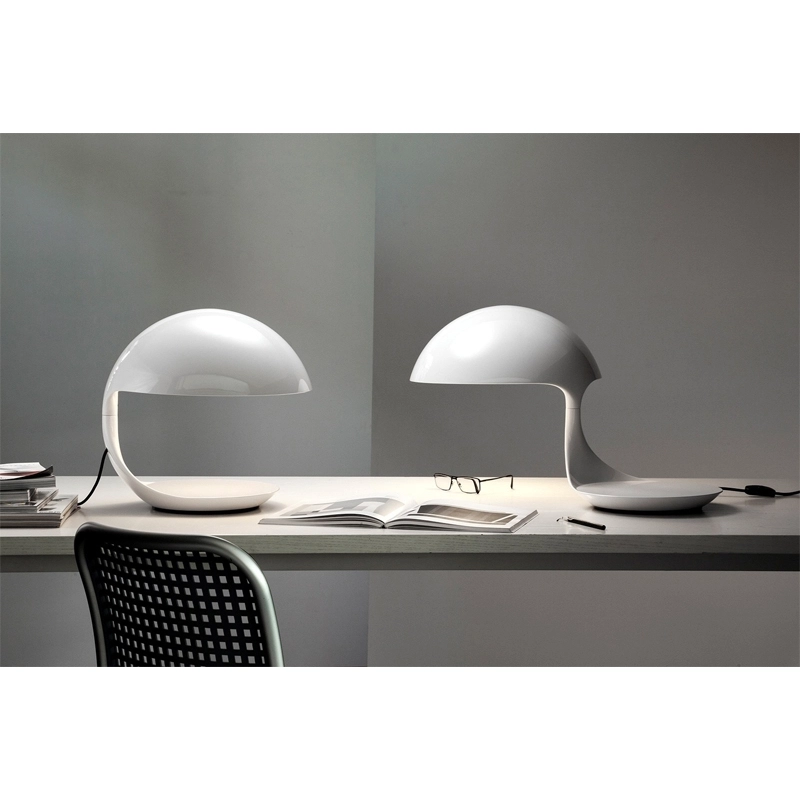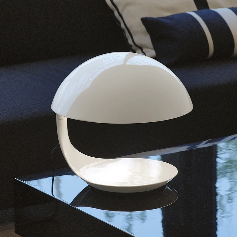 En 1968, Elio Martinelli crée la lampe à poser Cobra, éditée par Martinelli Luce. La conception de cette lampe repose sur une technique de moulage tout à fait innovante, qui est utilisée par le designer italien à plusieurs reprises pour la réalisation de nombreux autres luminaires. La structure en résine de Cobra s’inscrit dans une forme circulaire assez similaire à celle du reptile éponyme, quand il est prêt à bondir. Cobra est une lampe composée d’un bras orientable à 360°, qui associe une base en acier et un diffuseur moulé en résine. Son réflecteur interne est en aluminium peint. Luminaire au design caractéristique, la lampe à poser Cobra de Martinelli Luce est idéale pour la décoration de toutes les pièces à vivre, son éclairage est parfaitement adapté à un bureau, un coin lecture, ou sur la table basse d’un séjour.