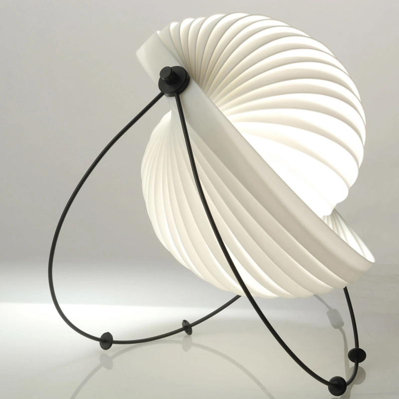 Eclipse est une petite lampe étonnante et intrigante, dessinée par Mauricio Klabin et éditée par Objekto. La lampe se caractérise par une conception très originale: elle est fabriquée à partir d'une seule bande plastique enroulée sur elle-même pour constituer un objet en trois dimensions. Elle peut être manipulée pour changer de forme et, par la même occasion, son orientation et la puissance de la lumière. Les pieds sont équipés de patins antidérapants, permettant de maintenir la lampe dans différentes positions. Le designer souhaitait créer un objet accessible sans sacrifier un design de qualité. Poétique et fonctionnelle, Eclipse peut être utilisée en lampe de chevet dans la chambre, en lampe d'appoint sans le salon ou dans une chambre d'enfant. La lampe fait notamment partie de la collection permanente du MoMa de New York.