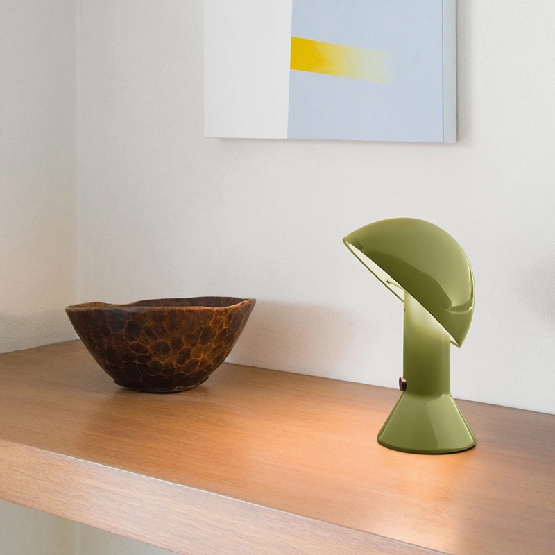 La lampe Elmetto dessinée par Elio Martinelli en 1976, est une lampe à poser éditée par la maison italienne Martinelli Luce. Fruit d’un design sobre et élégant, la structure moulée d’Elmetto se compose d’une base conique et d’un réflecteur hémisphérique en résine, avec un écran interne en aluminium.