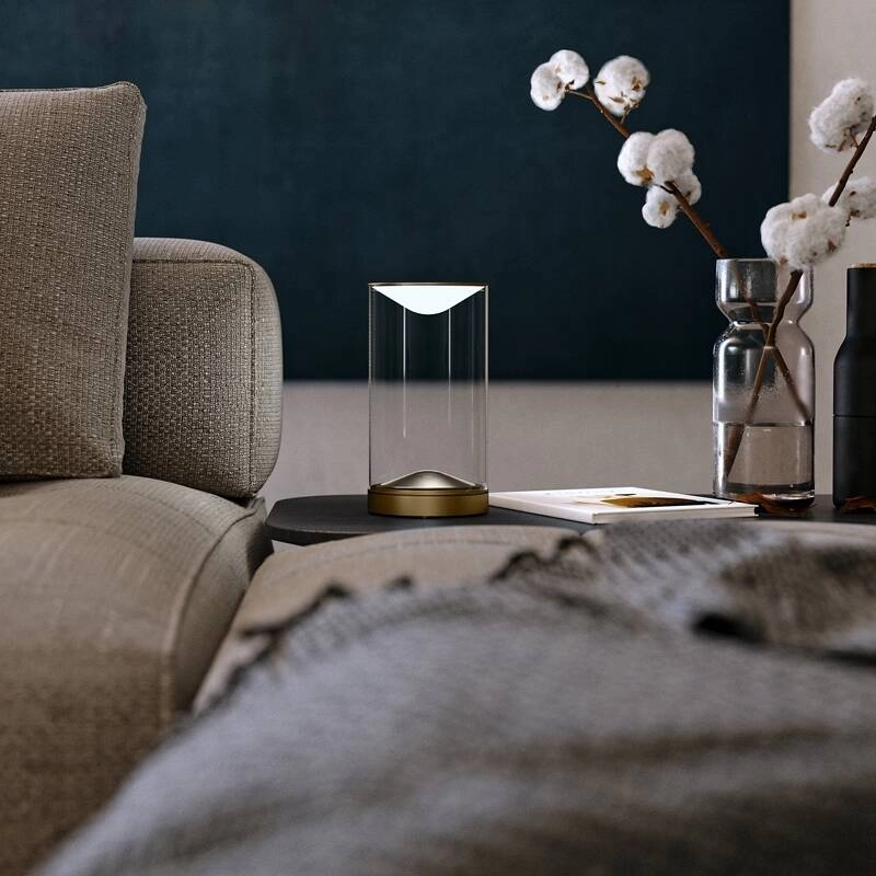 Eve est une petite lampe élégante composée d’un cylindre de verre transparent, d’un mince biseau métallique sur le dessus et d’une base avec variateur tactile. La base contient une LED dont le faisceau est dirigé vers le haut sur un cône réfléchissant. Editée par Lumina, le lampe Eve crée une lumière d’ambiance douce pour une ambiance chaleureuse dans le salon ou la chambre.