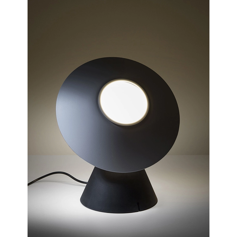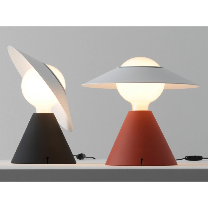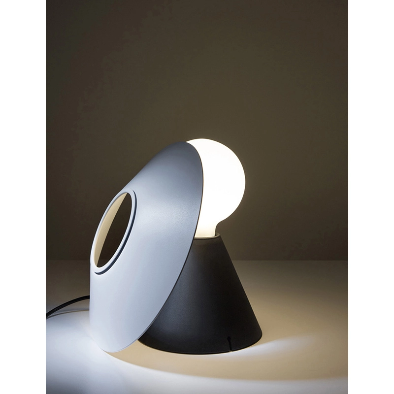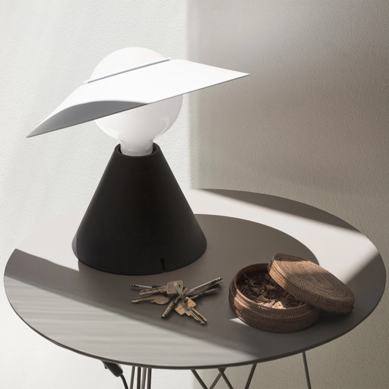 La lumière de la lampe à poser Fante s'oriente facilement grâce à un réflecteur situé sur la tête de l'ampoule. Conçue en 1978 et éditée par la maison Stilnovo, Fante est semblable à un chapeau à larges bords, définissant la silhouette d'une élégante figure féminine. La liberté d'inclinaison de l'abat-jour de Fante permet de contrôler en même temps la lumière vers le bas sur le plateau de la table et la lumière diffusée indirectement vers le haut. La base conique de Fante, douce et agréable au toucher, complète son design parfaitement proportionné. Editée par Stilnovo, la lampe à poser Fante est constituée d'une base conique en silicone et d'un disque orientable en aluminium peint en blanc.