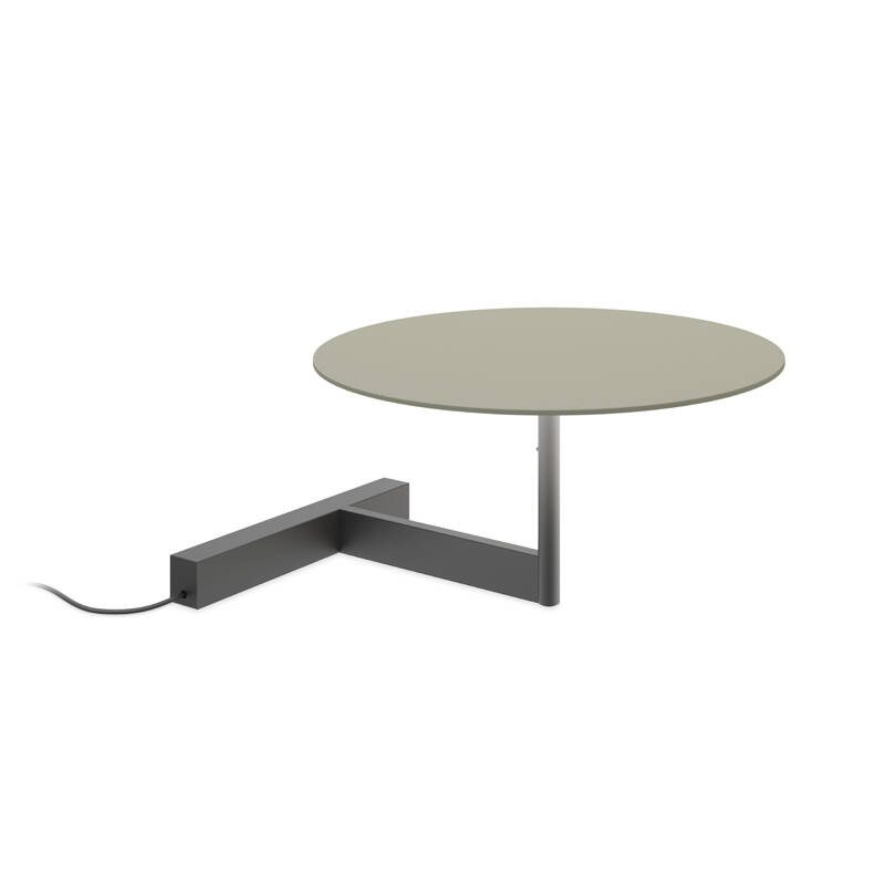 La version lampe à poser de Flat repose sur un pied angulaire qui tranche nettement avec la rondeur de son abat-jour, bien que les deux parties se complètent dans un équilibre parfaitement maitrisé.