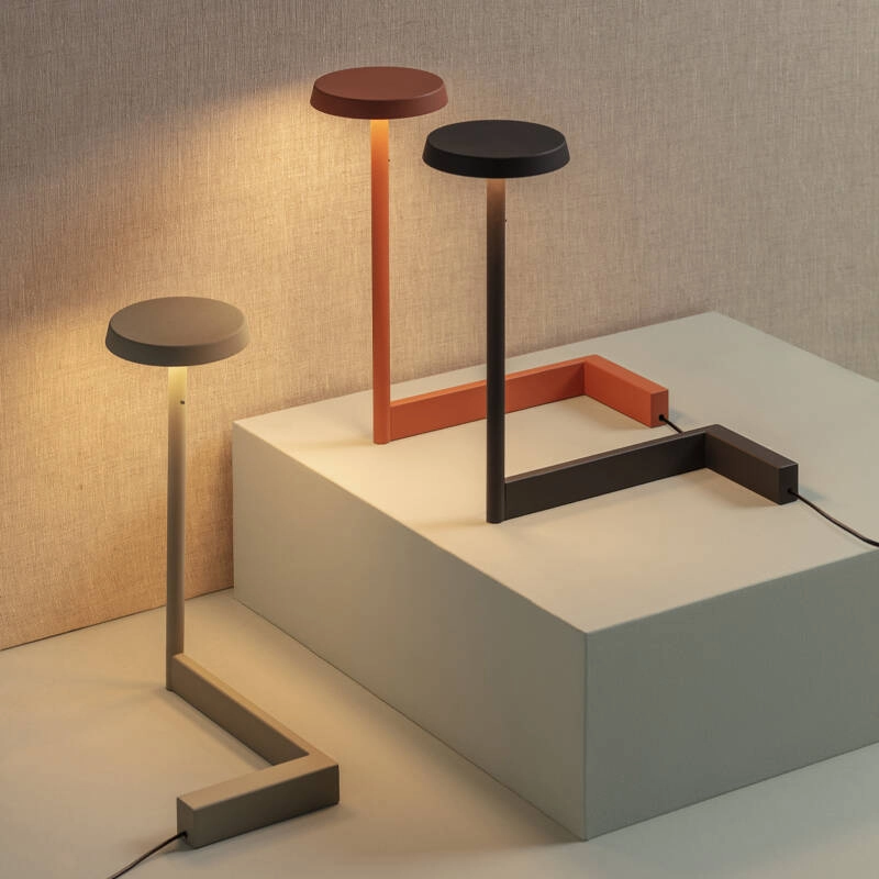 La version lampe à poser de Flat repose sur un pied angulaire qui tranche nettement avec la rondeur de son abat-jour, bien que les deux parties se complètent dans un équilibre parfaitement maitrisé.