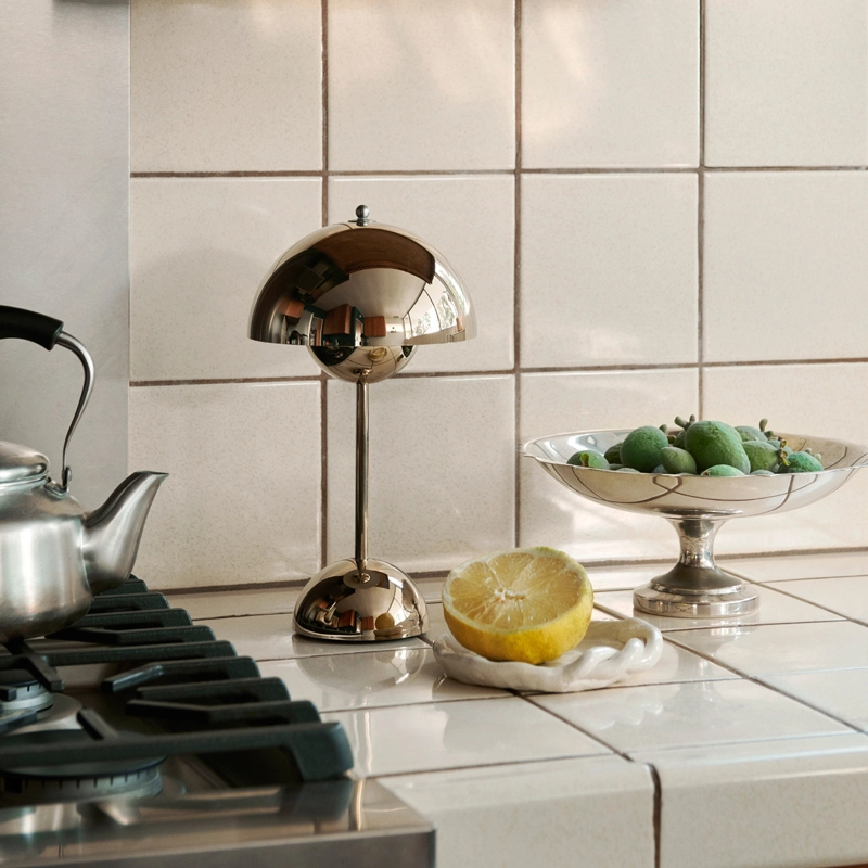 En 1968 la révolte des étudiants à Paris, à Rome et aux Etats-Unis renversaient les vieilles valeurs trop sévères et engageaient la génération « Flower-Power » faite de paix, d'amour et d'harmonie. La même année, Stanley Kubrick imaginait le futur, l'an 2001, mettant en vedette la chaise Panton devenue un classique du design, et l'homme était sur le point de poser le pied sur la lune. Dans le monde du design, une suspension colorée et ludique fleurissait dans les restaurants, les expositions et bientôt dans nos maisons. La lampe FlowerPot, avec ses deux demi sphères face à face, présente un design intemporel et de qualité, édité par & Tradition. Avec un large choix de couleurs, la lampe à poser FlowerPot VP9 est très pratique grâce à son fonctionnement sur batterie. Débarrassée de son câble, elle se déplace facilement et trouve sa place partout dans la maison ou dans les espaces collectifs.