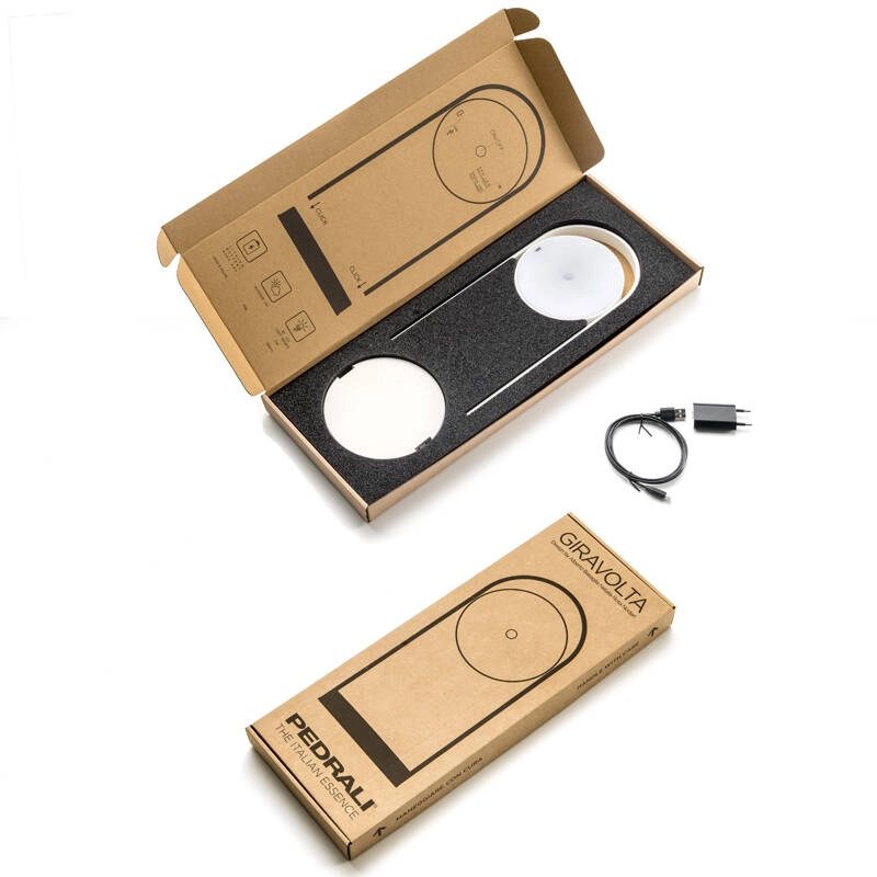 Giravolta est une lampe sans fil déclinée en trois dimensions, dessinée par Alberto Basaglia et Natalia Rota Nodari pour Pedrali. Deux disques en matière plastique, la base et le diffuseur LED qui tourne à 360 degrés et dirige la lumière, sont insérés dans un arc en extrudé d'aluminium qui devient une poignée confortable. La partie d'éclairage contient la carte à LED, la batterie lithium, la prise micro USB pour le chargement et le bouton d'alimentation. En option, un aimant dans la base permet de fixer la lampe sur des plateaux en métal ou au mur. Légère et pratique à transporter avec sa poignée, la lampe Giravolta de Pedrali s’utilise aussi bien à l’intérieur qu’à l’extérieur.