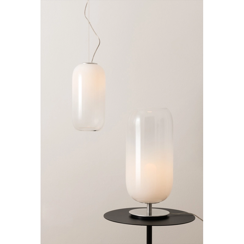 La lampe à poser Gople est issue de la collaboration entre BIG et Artemide. Gople est fabriqué à partir d'un diffuseur en verre soufflé à la bouche selon les anciennes techniques vénitiennes à Murano. La forme du verre aide la lumière à diffuser une douce lueur dans n'importe quelle pièce afin de créer une ambiance cosy.  Avec sa source LED, La lampe Gople combine à la fois une technologie moderne et des techniques anciennes. Le diffuseur est disponible en cinq finitions : verre cristal avec un dégradé blanc, verre transparent avec une finition métallisée ou encore argent, cuivre et bleu saphir.