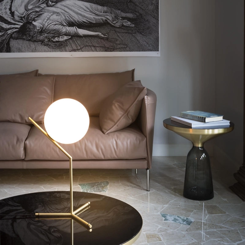 lampe IC light T1 High repose sur les principes physiques de l’équilibre afin de donner l’illusion de flotter dans l’air. La lampe à poser est composée d'une sphère en verre soufflé qui semble être juste en équilibre sur une fine tige de métal grâce à une jonction à peine visible. Le trépied sur lequel est accroché le diffuseur, est en forme de patte d’oiseau, créant une sensation de légèreté. Le diffuseur est en verre soufflé blanc, dégageant une lumière douce et chaleureuse, d’une forme sphérique permettant une diffusion de la lumière sur 360°. La