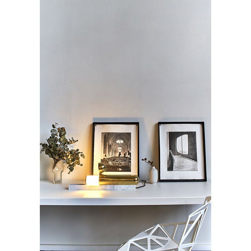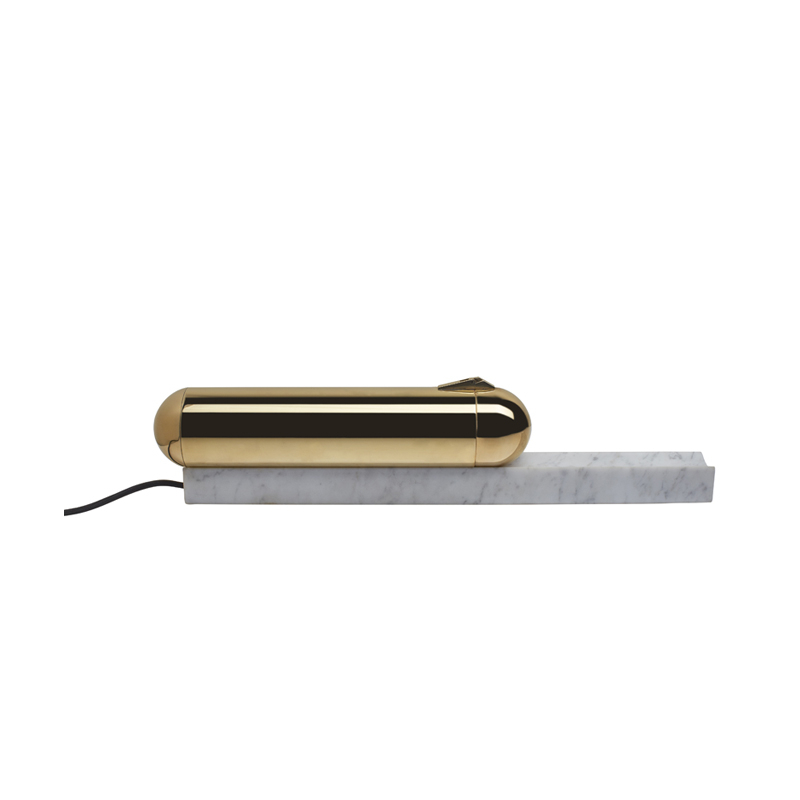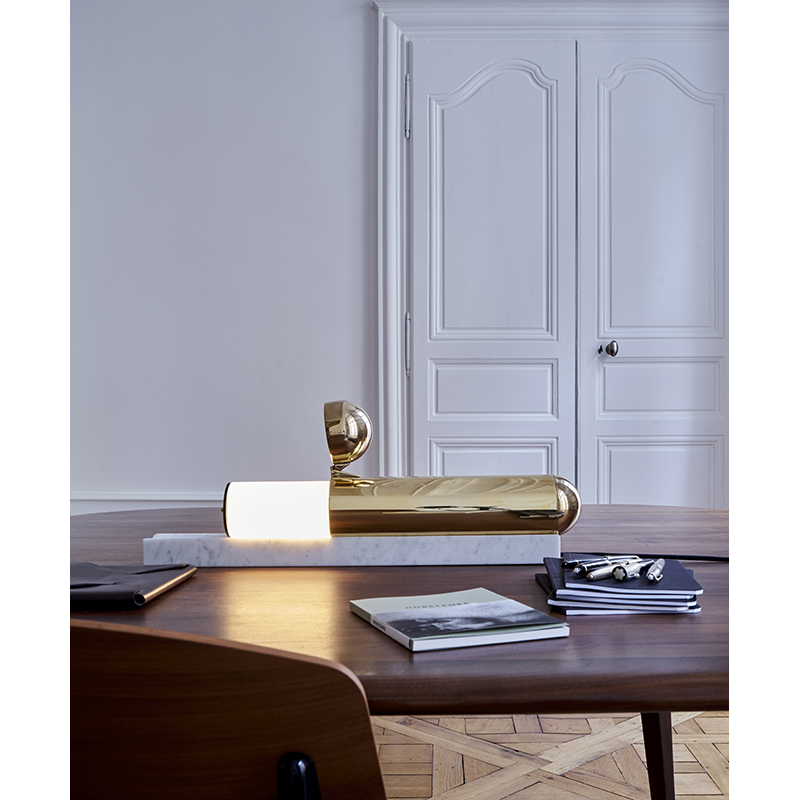 La lampe ISPTABLE de DCW éditions est un silex du XXIème siècle. Elle n'a pas d'interrupteur, pas de variateur et pas d'ampoule. La main prend possession de la lumière. Plus qu'une simple lampe de table, l'ISP TABLE est un bijou mécanique posé sur une rampe de marbre.