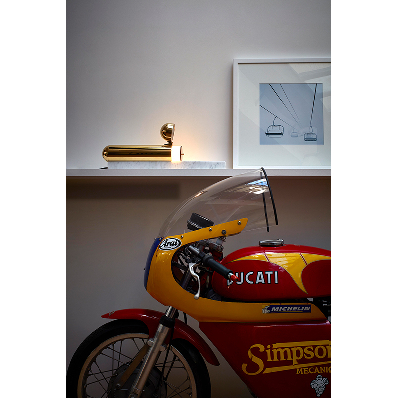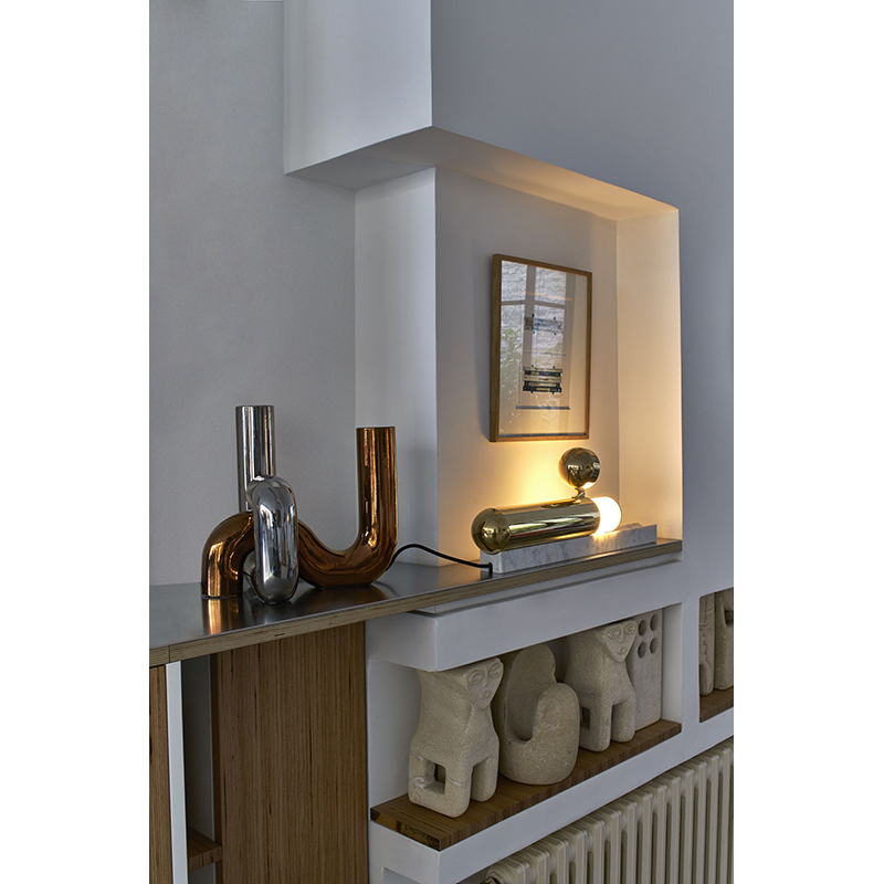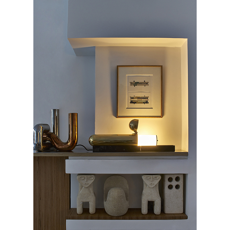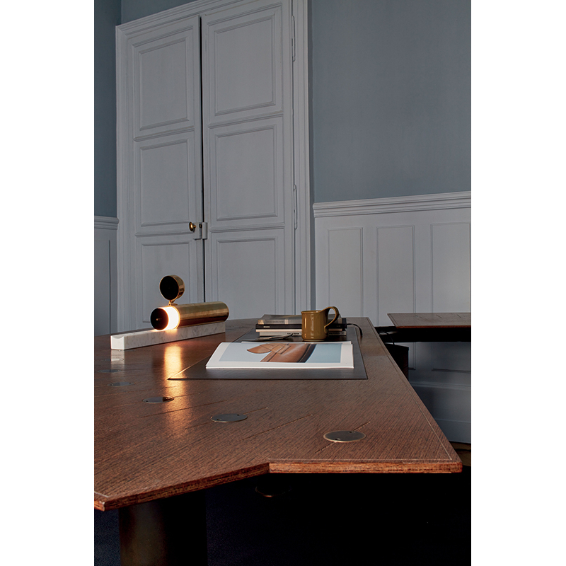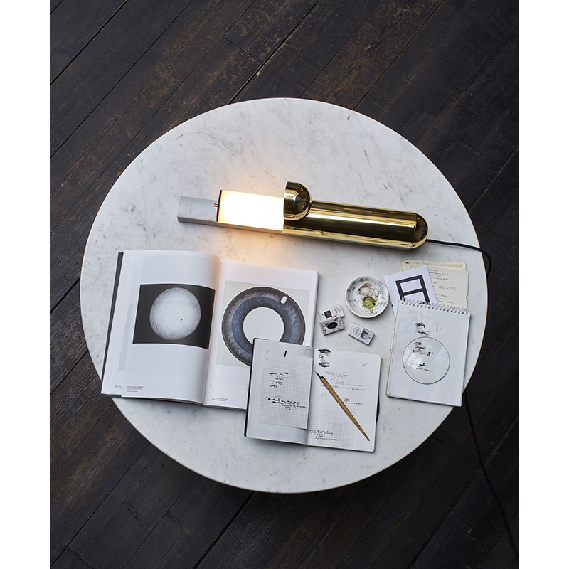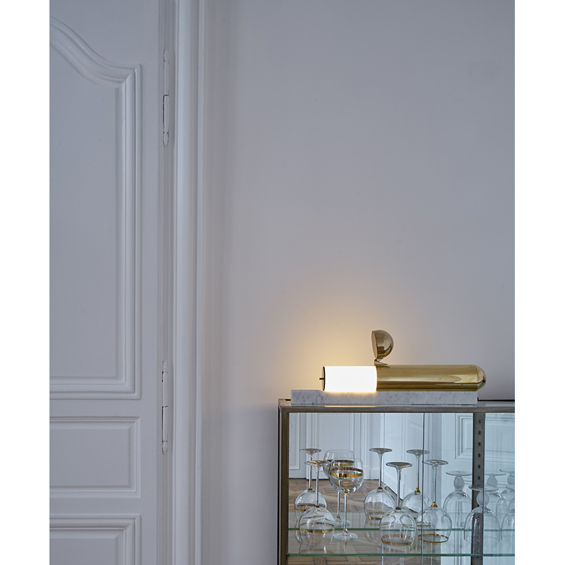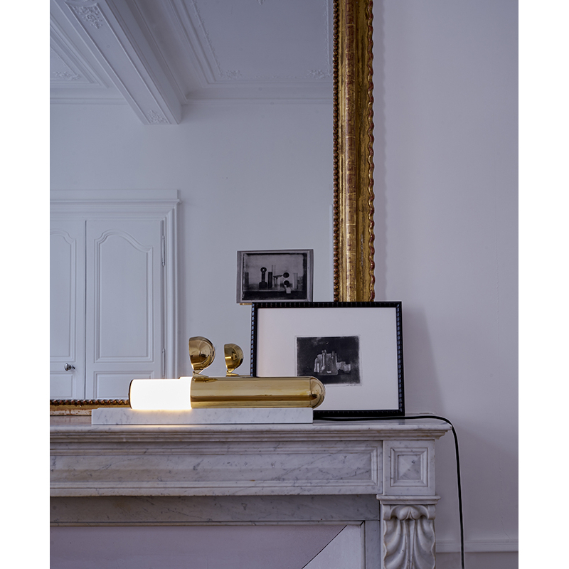 La lampe ISPTABLE de DCW éditions est un silex du XXIème siècle. Elle n'a pas d'interrupteur, pas de variateur et pas d'ampoule. La main prend possession de la lumière. Plus qu'une simple lampe de table, l'ISP TABLE est un bijou mécanique posé sur une rampe de marbre.