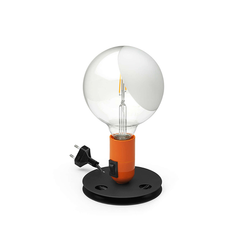 Achille Castiglioni crée, en 1972, cette lampe de table Lampadina très pratique. Elle possède une base en aluminium anodisé qui permet également d'enrouler le câble électrique. L'interrupteur ON/OFF basculant est placé sur la douille en bakélite. L'ampoule Globulux en verre transparent est partiellement sablée permettant une émission directe et diffuse. La Lampadina de Flos existe en noir ou en orange.