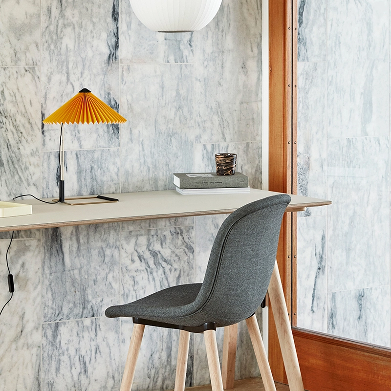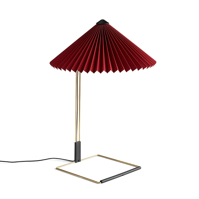 Dessinée par Inga Sempé pour Hay, la lampe de table Matin offre un design à la fois contemporain et poétique, avec une construction qui allie finesse visuelle et robustesse physique. Elle se compose d'un cadre en fil d'acier fini en laiton poli et d’un abat-jour en coton plissé disponible dans une variété de couleurs vives. La source lumineuse est une LED intégrée, offrant une lumière diffuse vers le bas. La lampe Matin de Hay est également équipée d’un variateur d’intensité lumineuse digital. Déclinée en deux tailles, cette lampe s’intègre aussi bien dans un salon, sur un bureau ou sur une table de chevet.