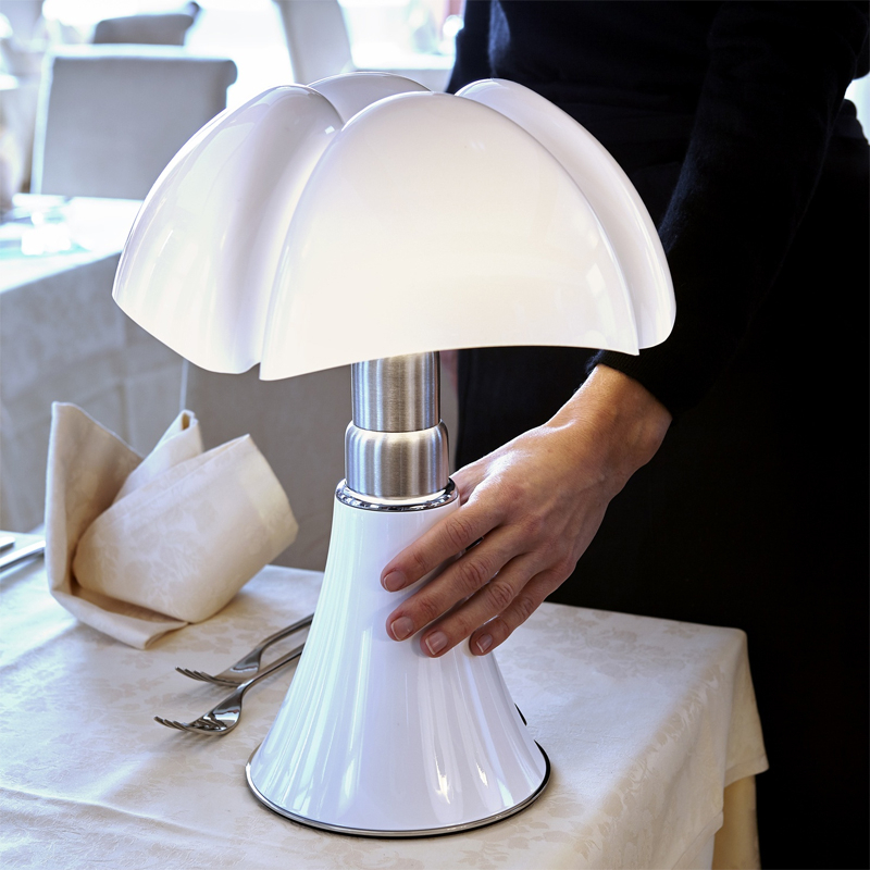 Minipipistrello sans fil est la version mini et portable de la Pipistrello, classique du design dessinée en 1966 par Gae Aulenti. Reine du design italien depuis plus de 50ans, la lampe Pipistrello Martinelli Luce est composée d’une base tulipe en métal, d’un bras en acier inoxydable brossé télescopique et d’un diffuseur en méthacrylate blanc opalin. Le dessin de son diffuseur s’inspire des ailes de la « pipistrello », chauve-souris d’Europe d’où elle tient son nom. En effet, la forme de la base évasée se développe en hauteur en s’élargissant au niveau des nervures du diffuseur comme les ailes d’une chauve-souris. La Minipipistrello Cordless est une lampe de table portable équipée d'une source LED intégrée, d'un variateur d'intensité lumineuse et d'une batterie rechargeable. Une lampe design à emporter partout avec vous !