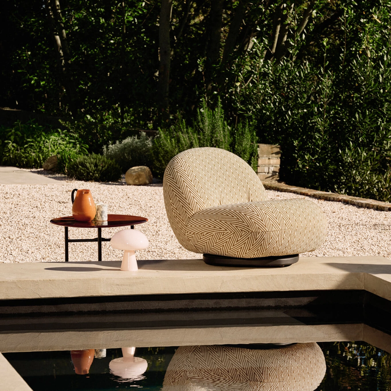 Pionnier dans la création de lampes « total look », le designer américain Bill Curry a dessiné la lampe Obello en 1971 à partir d’une forme unique en verre, éliminant le besoin d’une base séparée. En utilisant la forme d’un champignon, il puise son inspiration dans l’âge atomique, la course à l’espace et la pop culture qui allaient définir le Los Angeles des années 70. Malheureusement, il décède la même année et n’a jamais vu la lampe Obello entrer en production. Un demi-siècle plus tard, Gubi met en production pour la première fois ce design innovant dans une version portative. Avec un diffuseur en verre soufflé dépoli et de deux sources LED intégrées à intensité variable, cette lampe rechargeable peut facilement être déplacée entre l’intérieur et l’extérieur. En la rechargeant complètement pendant 4,5h, Obello offre jusqu’à 40 heures de lumière, créant une atmosphère douce à la tombée de la nuit. La matérialité du verre et la fabrication artisanale apportent un aspect tactile et rendent chaque lampe Obello unique. Le variateur d’intensité permet d’augmenter la lumière petit à petit pour prolonger la soirée après le coucher du soleil. Le verre dépoli et les deux sources LED permettent une lumière diffuse parfaitement distribuée. Bien qu’elle doive être rangée et rechargée à l’intérieur, la lampe Obello Gubi est résistante aux éclaboussures et donc aux petites averses. Elle peut également être posée au sol ou sur le sable. Elle est également disponible dans plusieurs coloris, permettant de s’adapter à différents styles d’intérieur et d’extérieur.