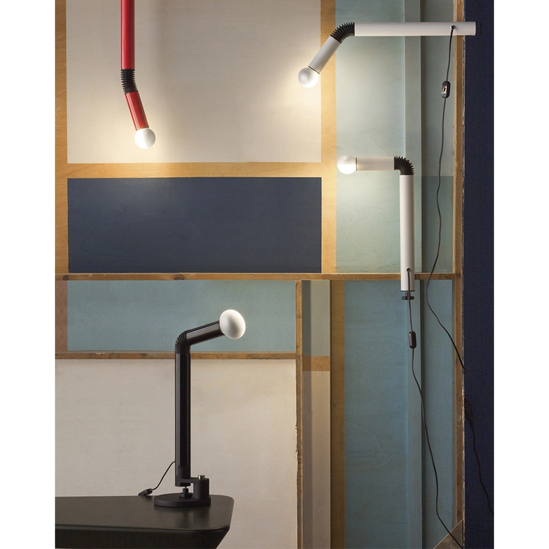 La collection de luminaires Periscopio éditée par Stilnovo a été conçue en pleine « ère spatiale ». Le caoutchouc souple qui recouvre l'articulation rappelle les joints des combinaisons des astronautes. Le système d'articulation et de rotation du bras permet d'ajuster Periscopio dans pratiquement n'importe quelle position. La source LED spéciale, dont la moitié est recouverte d'une surface argentée, évite les éblouissements. Les luminaires Periscopio sont disponibles en lampe à poser et en deux tailles de lampadaires.