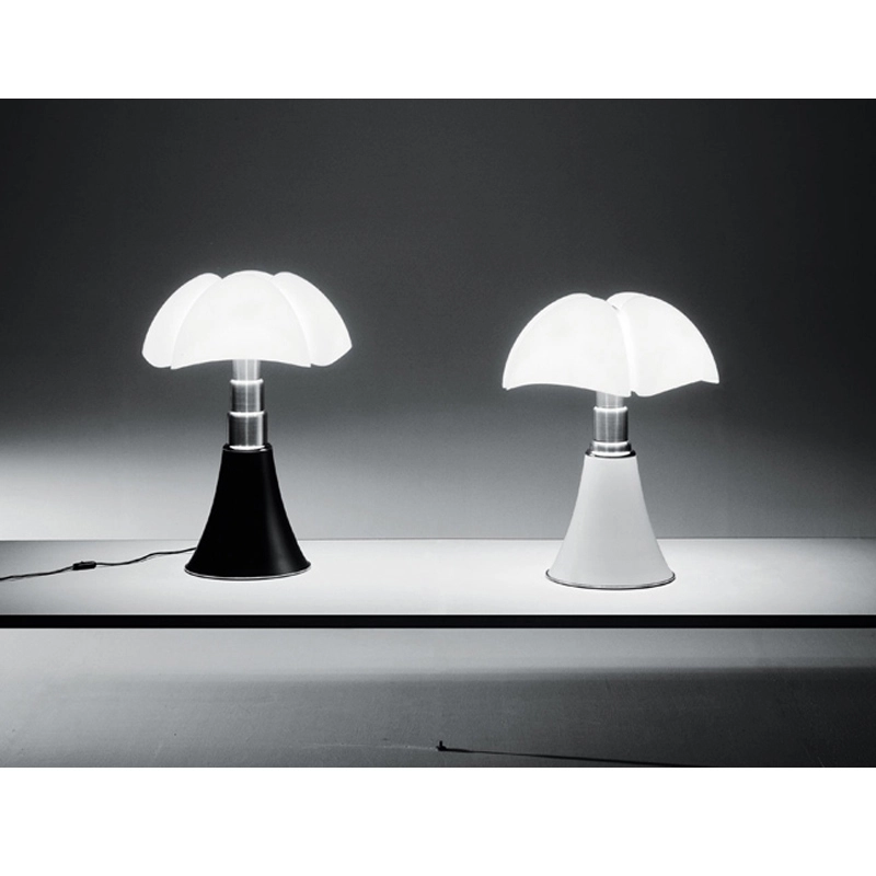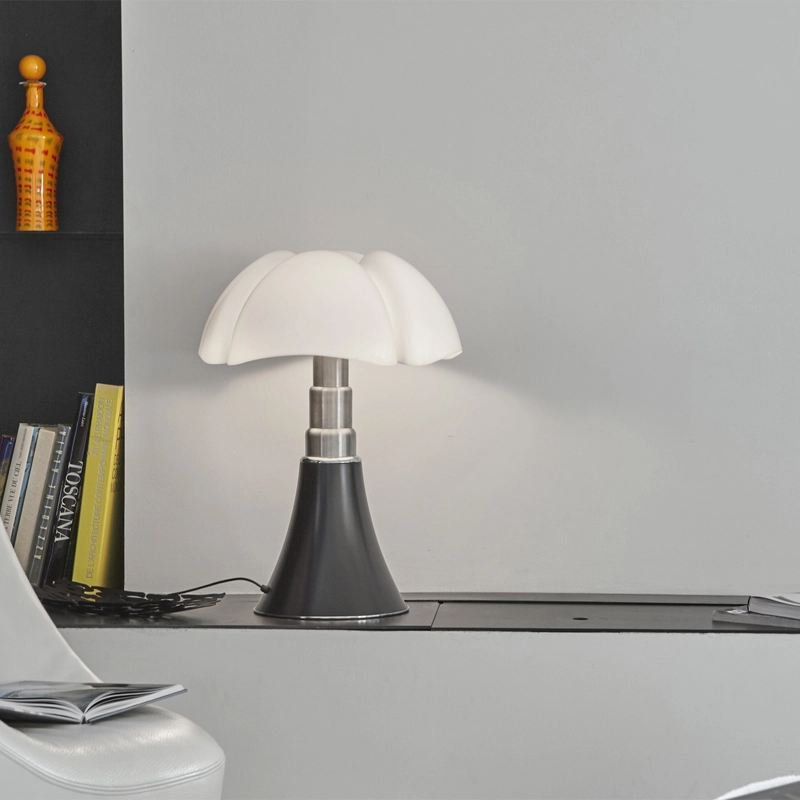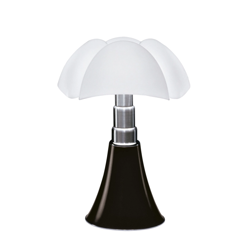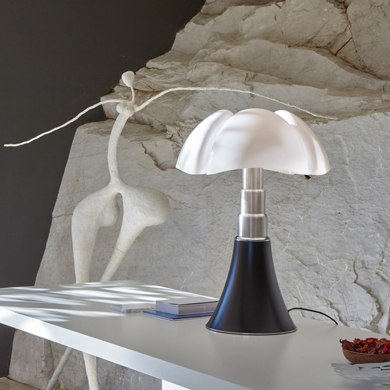 Ce classique du design a été dessiné en 1966 par Gae Aulenti, qui utilise des techniques très innovantes pour l'époque. Reine du design italien depuis plus de 50 ans, la lampe de table Pipistrello Martinelli Luce est composée d’une base tulipe en métal, d’un bras en acier inoxydable brossé télescopique et d’un diffuseur en méthacrylate blanc opalin. La Pipistrello Martinelli Luce est une lampe de table ou de sol avec une lumière diffuse. Sa hauteur est réglable entre 66 et 86cm, grâce à un système télescopique. La base de la lampe Pipistrello Martinelli Luce est en métal peint en marron très foncé ou blanc. Le dessin de son diffuseur s’inspire des ailes de la « pipistrello », chauve-souris d’Europe d’où elle tient son nom. En effet, la forme de la base évasée se développe en hauteur en s’élargissant au niveau des nervures du diffuseur comme les ailes d’une chauve-souris. La lumière diffuse que la Pipistrello Martinelli Luce renvoie et l’ingéniosité de son bras télescopique ont participés à construire le succès qu’elle connaît aujourd’hui. Pipistrello Martinelli Luce est un objet indémodable et a fait le tour de tous les plus grands musées du monde entier. Un exemplaire est encore présent dans la collection permanente du MoMA.