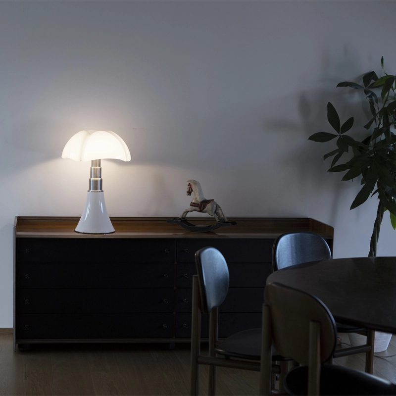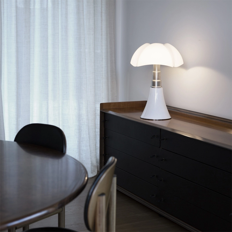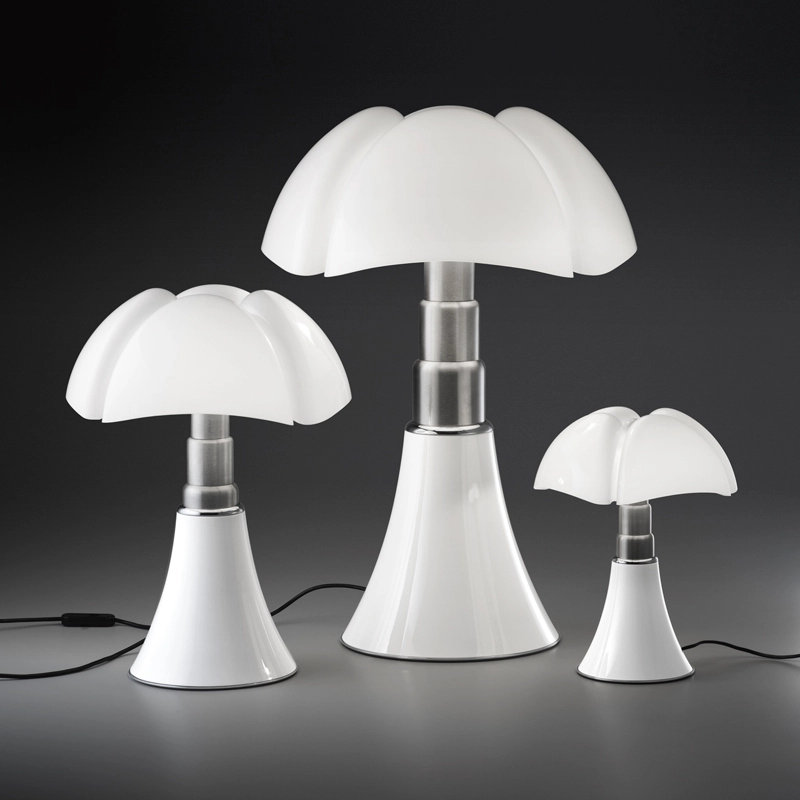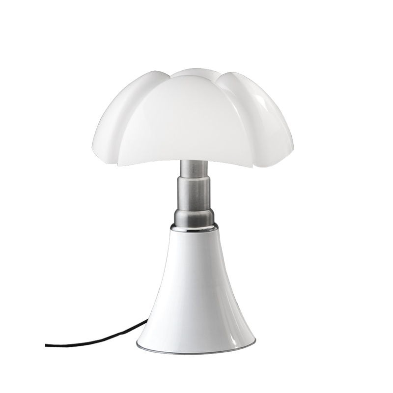 La lampe Pipistrello Medio est une version plus petite de la célèbre Pipistrelloclassique du design dessinée en 1966 par Gae Aulenti. Reine du design italien depuis plus de 50ans, la lampe Pipistrello Martinelli Luce est composée d’une base tulipe en métal, d’un bras en acier inoxydable brossé télescopique et d’un diffuseur en méthacrylate blanc opalin. La Pipistrello Medio Martinelli Luce est une lampe de table avec une lumière diffuse. Plus petite que la version classique, sa hauteur est réglable entre 50 et 62 cm de hauteur, grâce à un système télescopique. Cette version est équipée d'une source LED intégrée et d'un variateur d'intensité lumineuse. Le dessin de son diffuseur s’inspire des ailes de la « pipistrello », chauve-souris d’Europe d’où elle tient son nom. En effet, la forme de la base évasée se développe en hauteur en s’élargissant au niveau des nervures du diffuseur comme les ailes d’une chauve-souris. La lumière diffuse que la Pipistrello Medio Martinelli Luce renvoie et l’ingéniosité de son bras télescopique ont participés à construire le succès qu’elle connaît aujourd’hui.