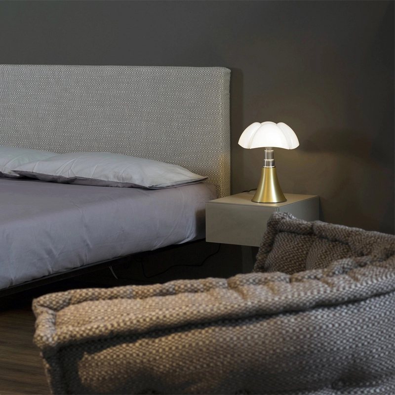 La lampe Pipistrello Medio est une version plus petite de la célèbre Pipistrelloclassique du design dessinée en 1966 par Gae Aulenti. Reine du design italien depuis plus de 50ans, la lampe Pipistrello Martinelli Luce est composée d’une base tulipe en métal, d’un bras en acier inoxydable brossé télescopique et d’un diffuseur en méthacrylate blanc opalin. La Pipistrello Medio Martinelli Luce est une lampe de table avec une lumière diffuse. Plus petite que la version classique, sa hauteur est réglable entre 50 et 62 cm de hauteur, grâce à un système télescopique. Cette version est équipée d'une source LED intégrée et d'un variateur d'intensité lumineuse. Le dessin de son diffuseur s’inspire des ailes de la « pipistrello », chauve-souris d’Europe d’où elle tient son nom. En effet, la forme de la base évasée se développe en hauteur en s’élargissant au niveau des nervures du diffuseur comme les ailes d’une chauve-souris. La lumière diffuse que la Pipistrello Medio Martinelli Luce renvoie et l’ingéniosité de son bras télescopique ont participés à construire le succès qu’elle connaît aujourd’hui.